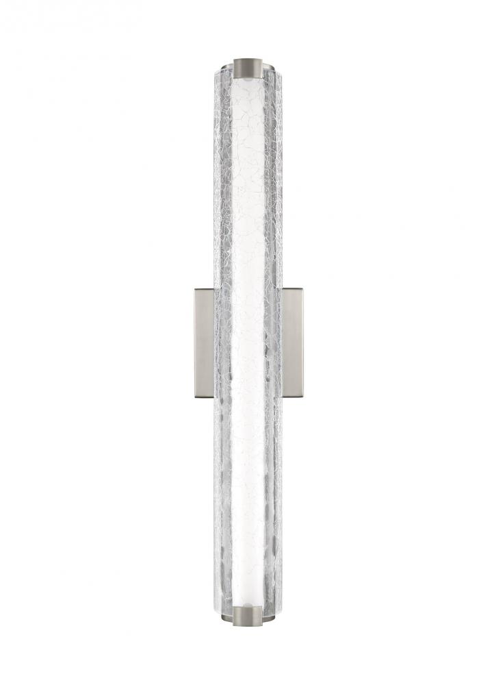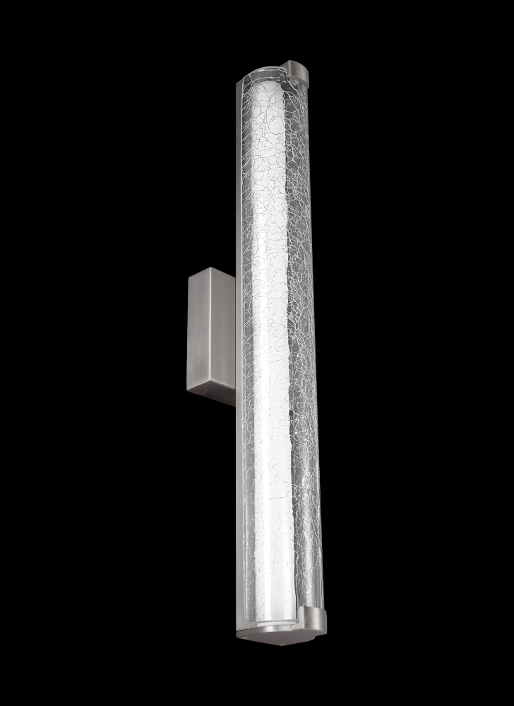 The Cutler one-light wall sconce in chrome offers shadow-free lighting in your powder room, spa, or main bathroom. The sleek linear profile of the Cutler Collection creates a perfect, contemporary backdrop for two unique glass options. Tiles of either Clear Crackle glass or Clear Staggered Rock glass are set in an organic version of a subway tile "look" and allow the LED light to shine through, adding rich sparkle to the room. Cutler is available in two finish options: Chrome and Satin Nickel.