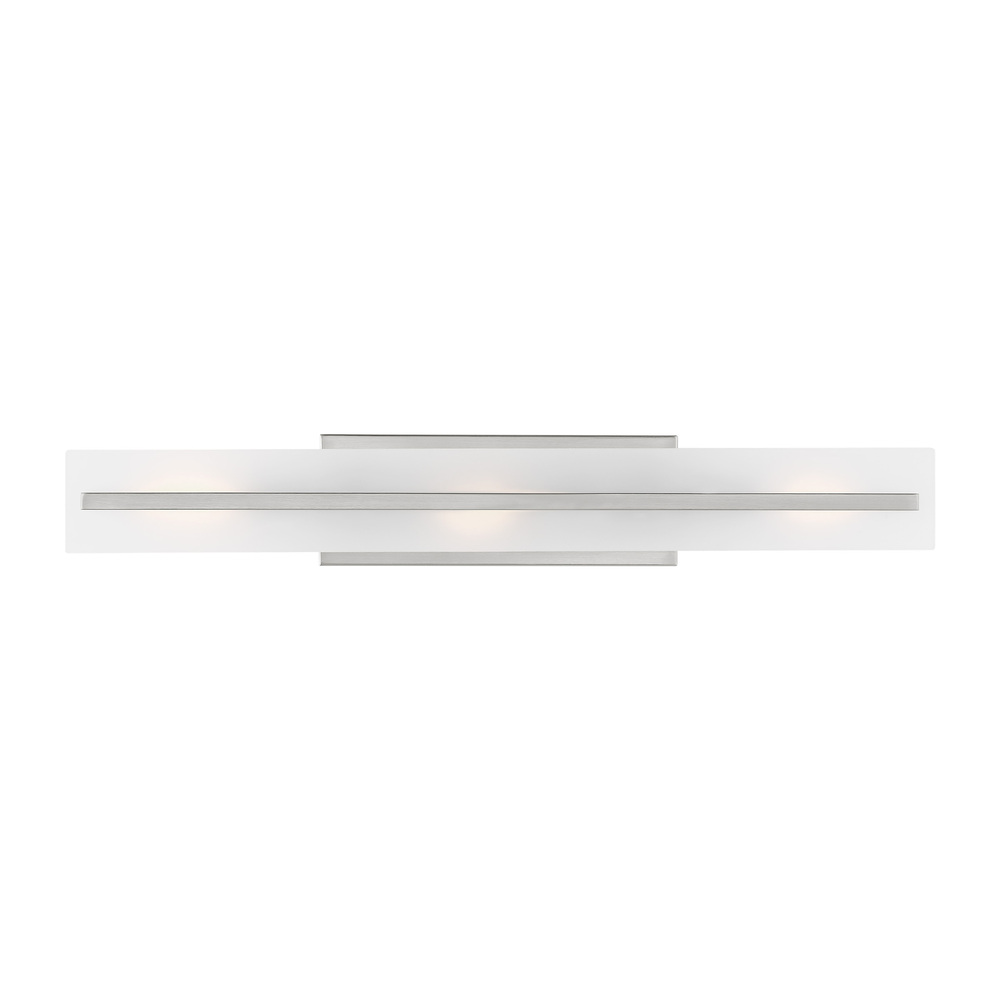 The Dex three light vanity fixture in brushed nickel silver is a contemporary design with three finishes and white acrylic diffuser creating a crisp look and bright clean ambiance. With the clean lines and classic styling, the Dex vanity series is versatile enough to be used in any transitional setting.