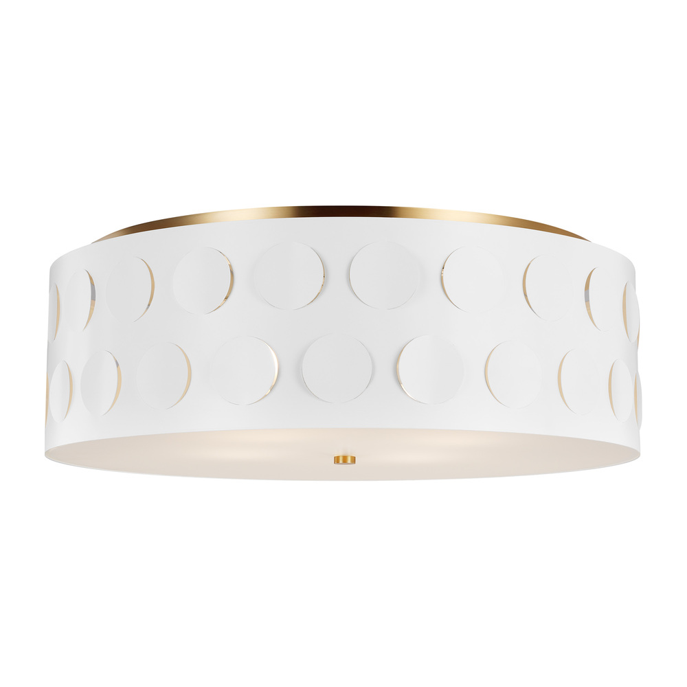 A cheerful, modern take on the classic flush mount, this fixture is crafted of steel and a matte white motif design with burnished brass accents.