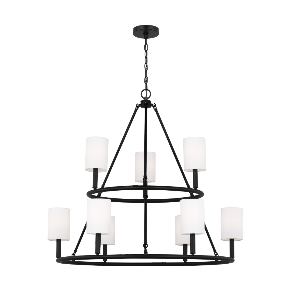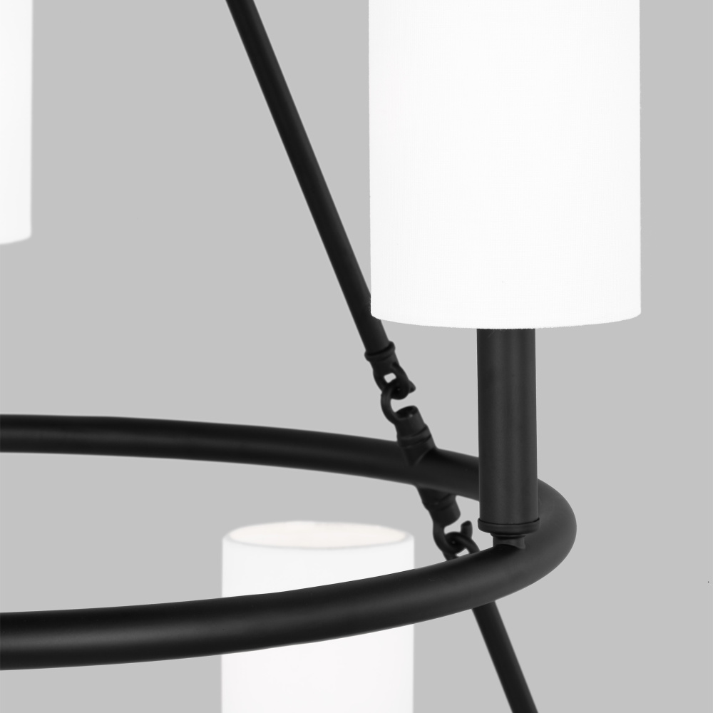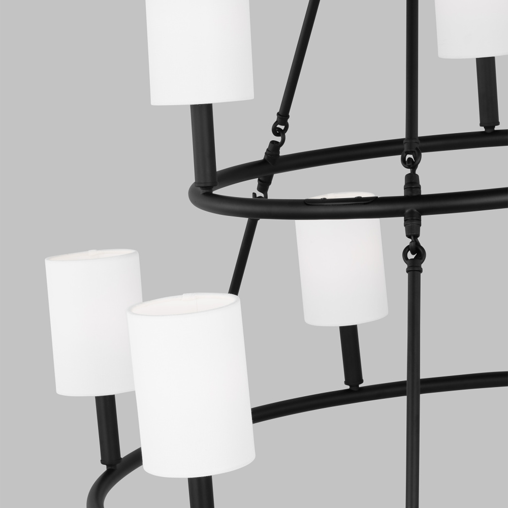 Designed by Drew & Jonathan Scott, Egmont is a classic design with clean lines and white linen shades, perfect for farmhouse or transitional style settings. It's made from metal featuring a wagon wheel body on the chandelier and a circular backplate on the wall sconce. The open framework at the top and bottom assures strong up-light. The overall style and multiple finishes work as well in a modern-farmhouse kitchen as they do in a vintage industrial loft.