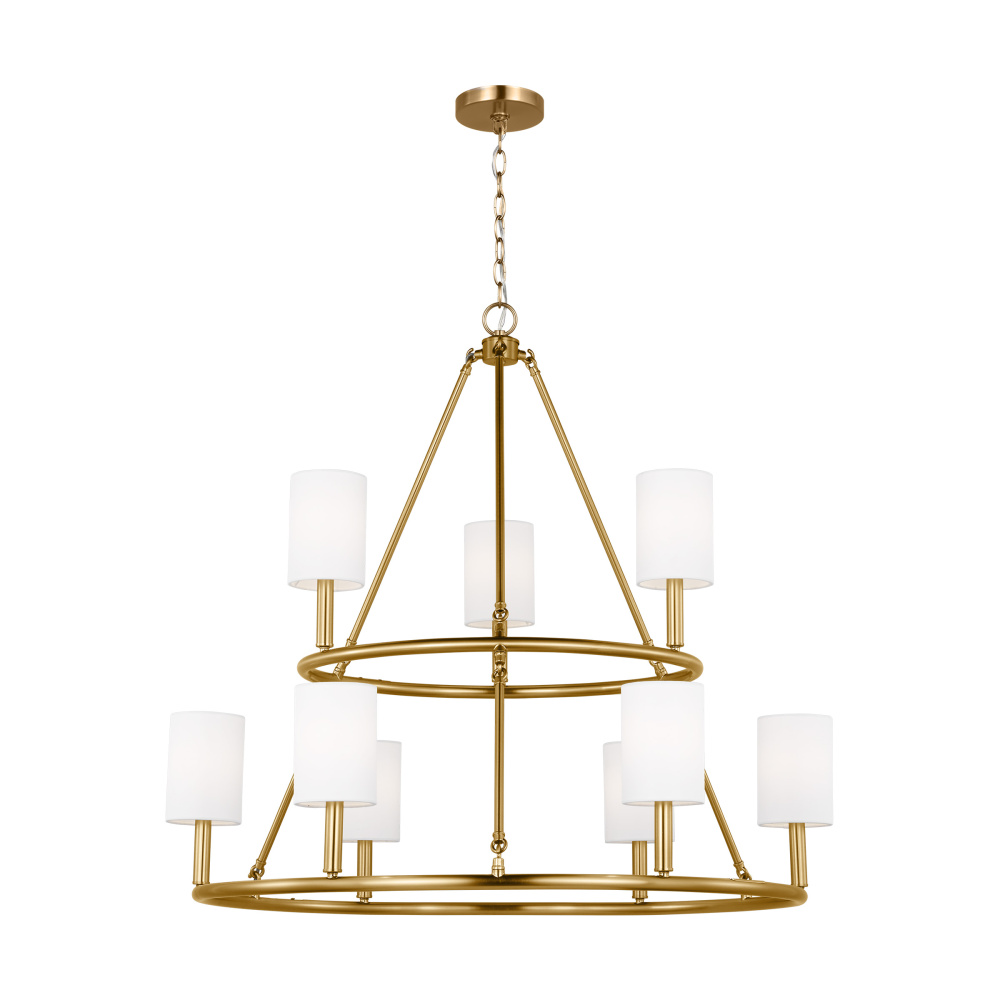 Designed by Drew & Jonathan Scott, Egmont is a classic design with clean lines and white linen shades, perfect for farmhouse or transitional style settings. It's made from metal featuring a wagon wheel body on the chandelier and a circular backplate on the wall sconce. The open framework at the top and bottom assures strong up-light. The overall style and multiple finishes work as well in a modern-farmhouse kitchen as they do in a vintage industrial loft.