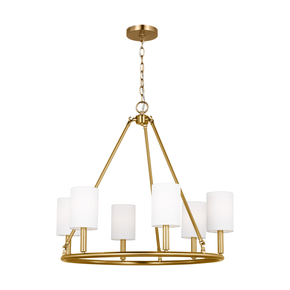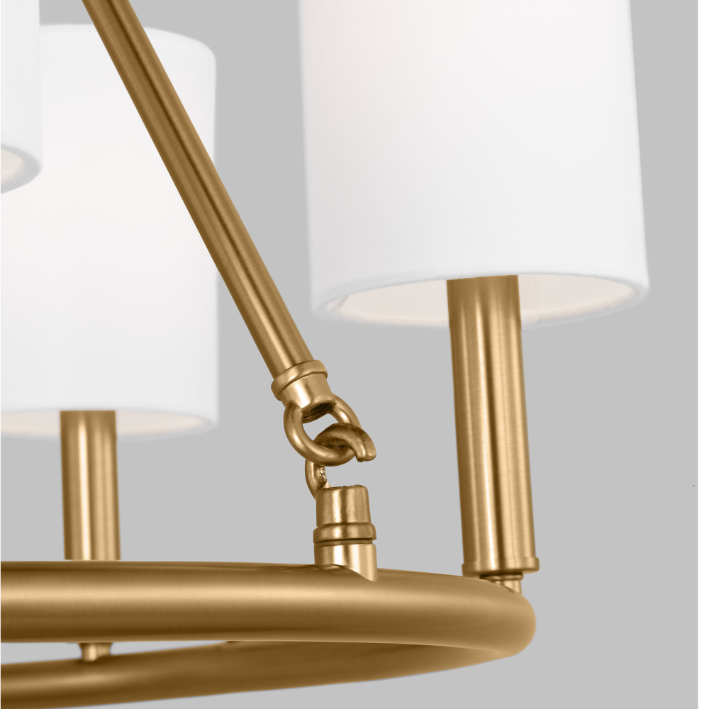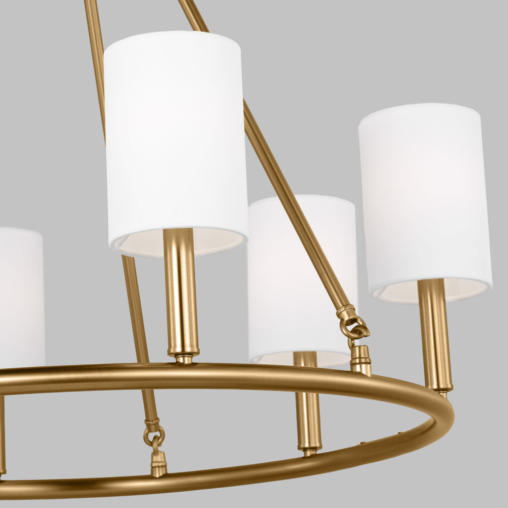 Designed by Drew & Jonathan Scott, Egmont is a classic design with clean lines and white linen shades, perfect for farmhouse or transitional style settings. It's made from metal featuring a wagon wheel body on the chandelier and a circular backplate on the wall sconce. The open framework at the top and bottom assures strong up-light. The overall style and multiple finishes work as well in a modern-farmhouse kitchen as they do in a vintage industrial loft.
