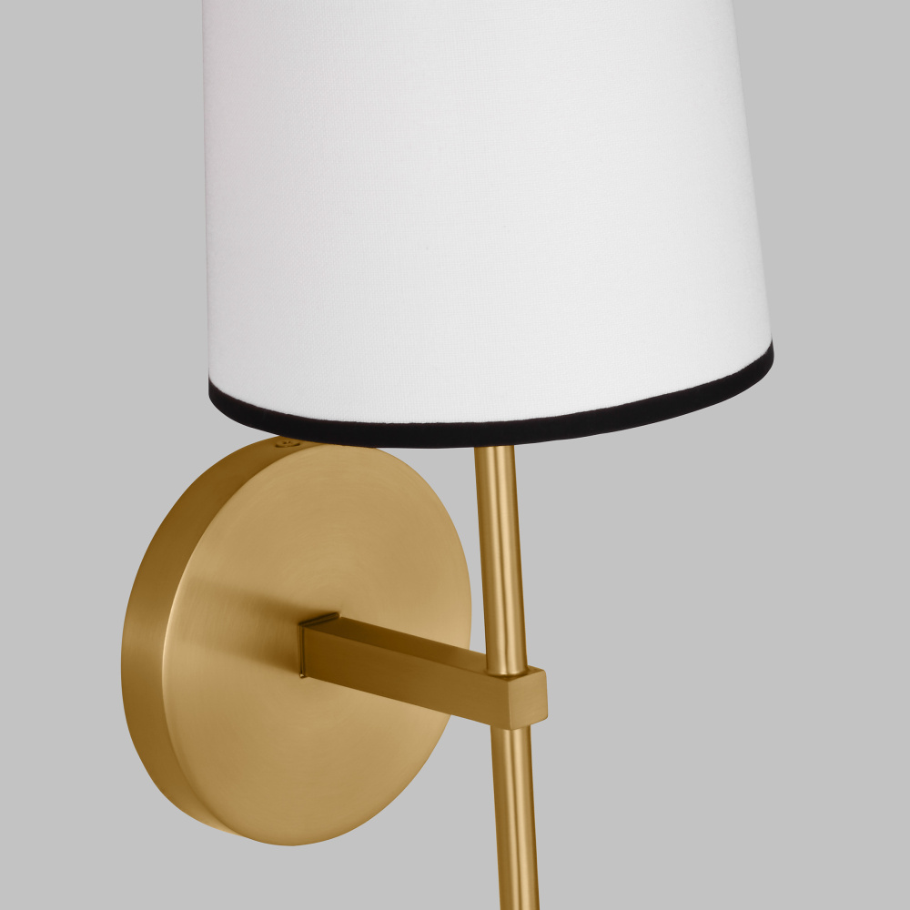 Inspired by the elegant tailoring of kate spade apparel, preppy and classic. Ellison features elegant proportions, playful round/square brass details, and graphic black tipping on the cream shade. A round brass base keeps the lamp sturdy and strong while adding elegance to the look. Burnished brass metal is softened with white linen with Black linen bands that reveals its beautiful subtle texture when lit. Turn the lamp on and off with a simple tug of the pull chain switch.
