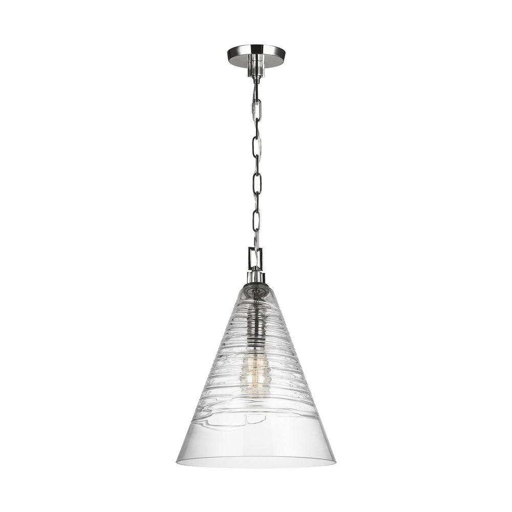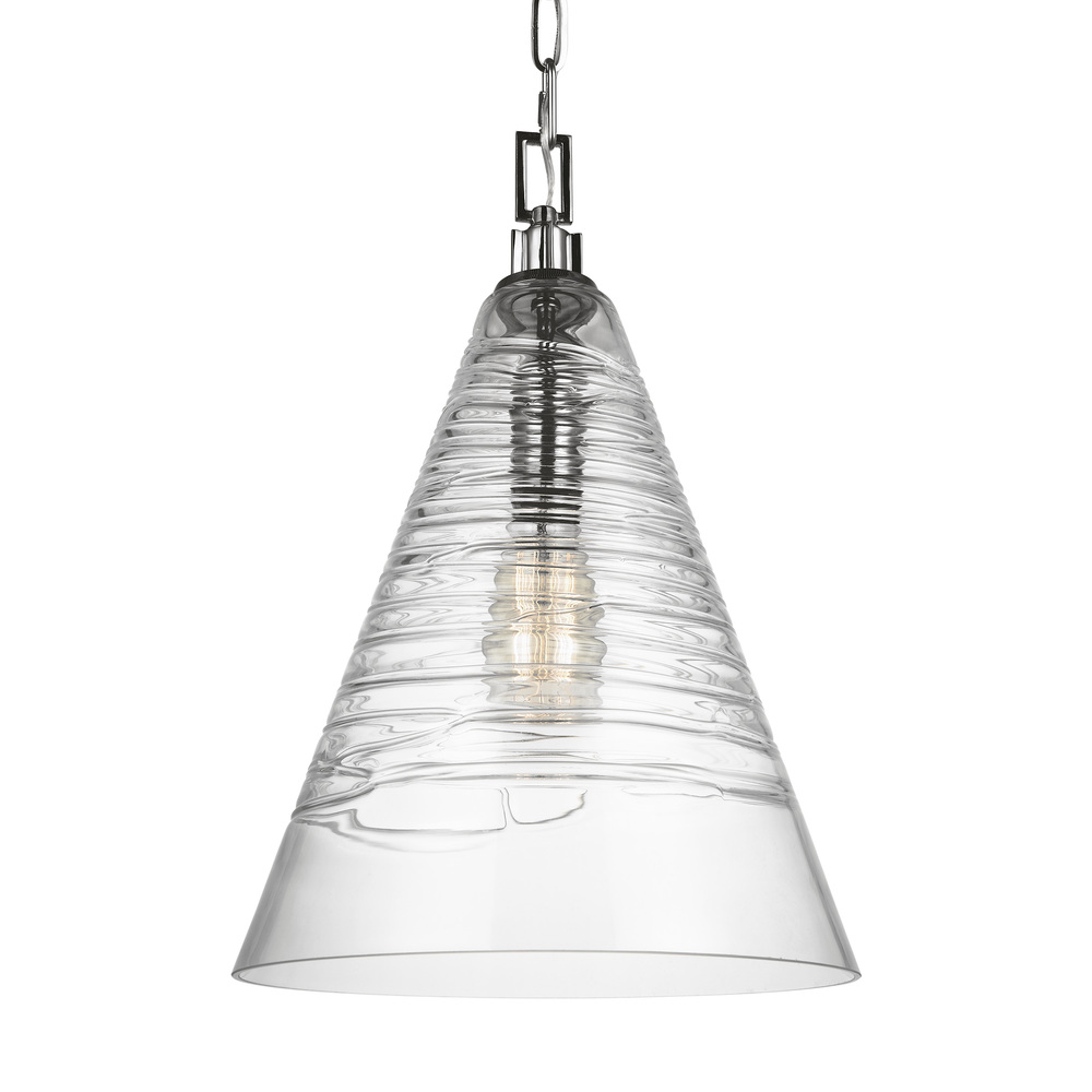 The Sean Lavin Elmore one-light indoor pendant in burnished brass provides abundant light to your home while adding style and interest. The Elmore pendant collection from Sean Lavin features Clear Candy glass achieved through a multi-step, artisanal process of wrapping small rods of glass around the glass shade to create a textured, vibrant surface that subtly conceals the light source and refracts the light to create an outstanding sparkle. These spectacular, large-scale glass shades are available in two classic profiles, a cone or cylinder (both shapes are 18" high), which would easily accent an urban, eclectic loft and more traditional settings looking for rich textures to complement the surrounding decor. Beautiful cast details, like the tailored square link chain in a Chrome or Burnished Brass finish, complete this timeless look, which is versatile enough to work well as entry, dining room, living room, bedroom, or kitchen lighting.