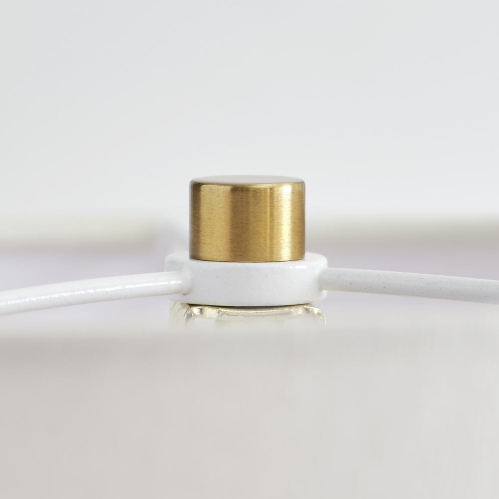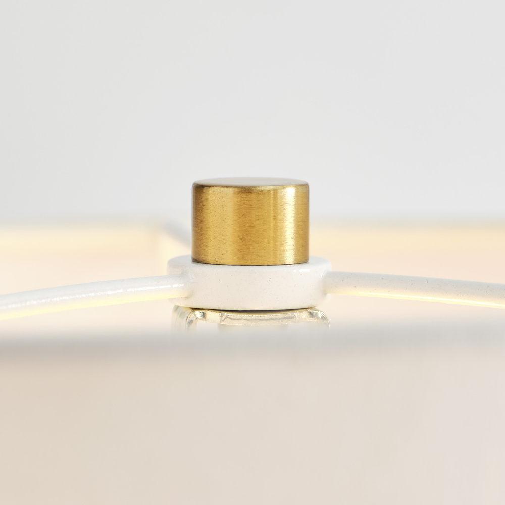 Features a square base, gold stem, and fabric white linen shade