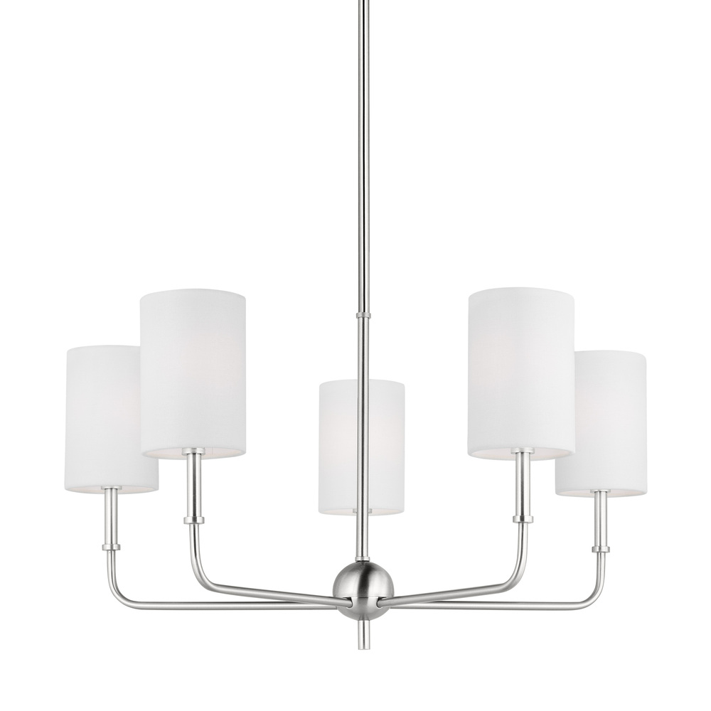 The Foxdale five light single tier chandelier in brushed nickel silver encompasses the new traditional style with flawless execution. Refined and clean-lined, this classic silhouette is timeless without being stuffy. Perfectly transitional, this collection can be placed in any home regardless of style. Topped with White Linen Shades to complete the design.