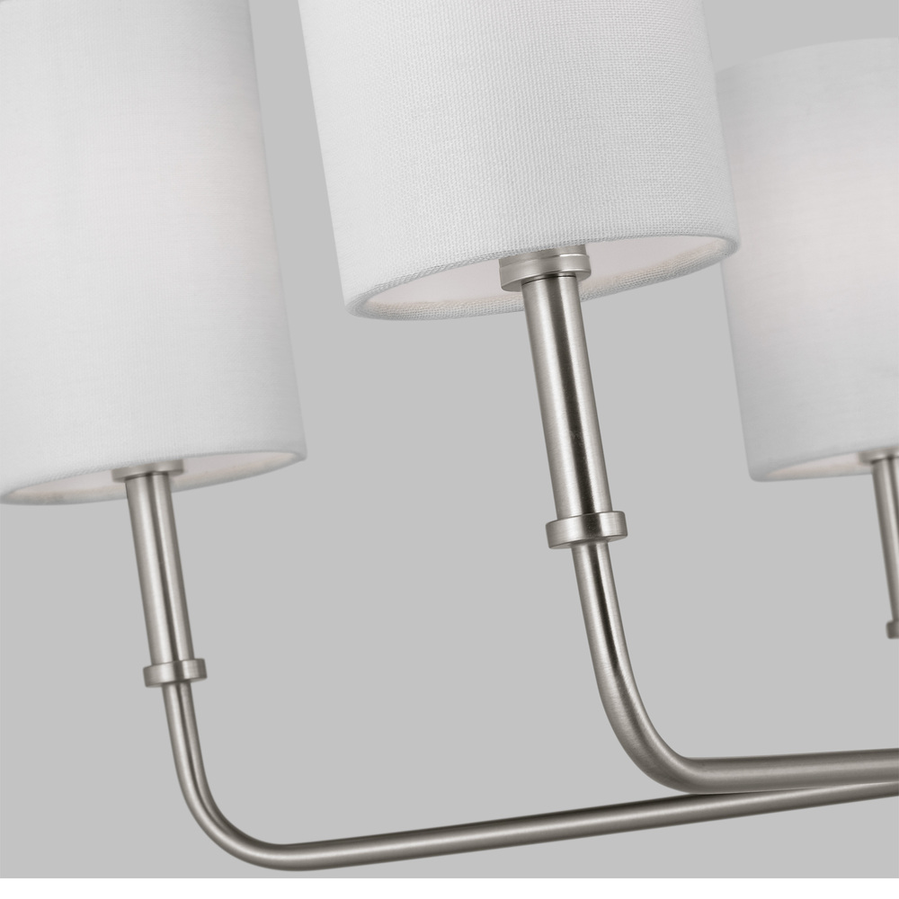 The Foxdale five light single tier chandelier in brushed nickel silver encompasses the new traditional style with flawless execution. Refined and clean-lined, this classic silhouette is timeless without being stuffy. Perfectly transitional, this collection can be placed in any home regardless of style. Topped with White Linen Shades to complete the design.