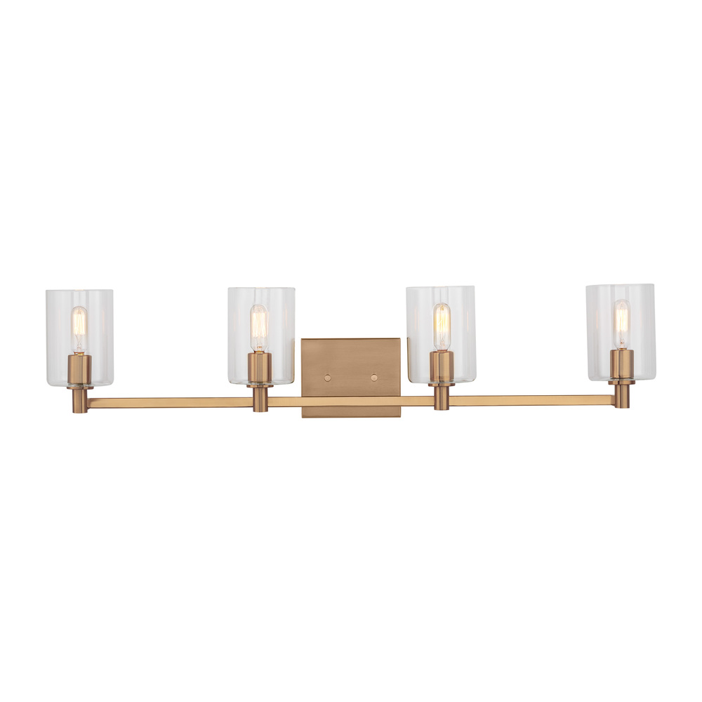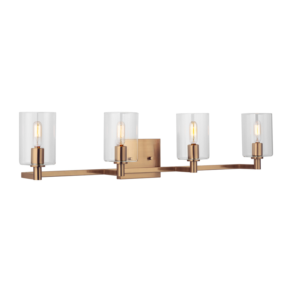 The Fullton four light vanity fixture in Satin Brass is sleek, contemporary, and uber minimalistic. Visual interest is created using a mix of rectangular and round frames, a subtle design detail. Although this collection is contemporary, it can be mixed in with variety of collections with ease.