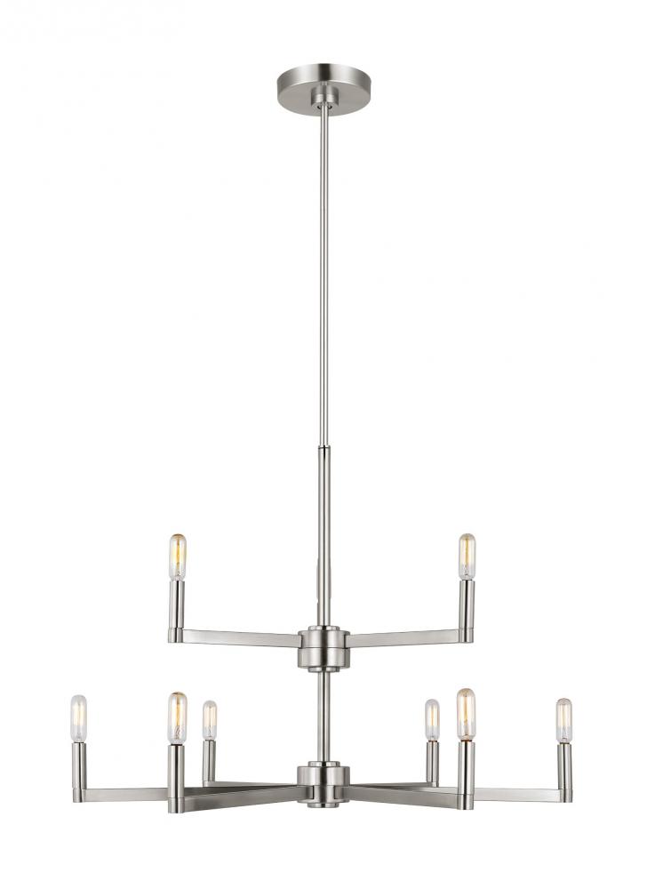 The Fullton nine light multi-tier chandelier in brushed nickel silver is sleek, contemporary, and uber minimalistic. Visual interest is created using a mix of rectangular and round frames, a subtle design detail. Although this collection is contemporary, it can be mixed in with variety of collections with ease.