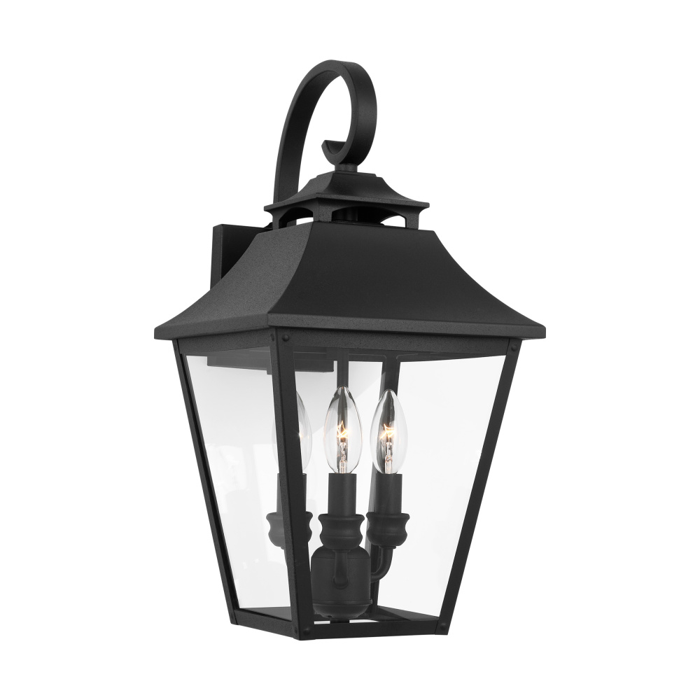 Designed by Sean Lavin, the Galena three-light outdoor wall fixture in textured black enhances the beauty of your property, makes your home safer and more secure, and increases the number of pleasurable hours you spend outdoors. Galena is a Europe-inspired classic lantern. Simple and refined, Galena features a gently curved hook detail atop a vented, square-off roofline and candle tubes floating within the tapered clear glass shades. Galena is a warm, welcoming silhouette offered in a Sable or Textured Black finish.