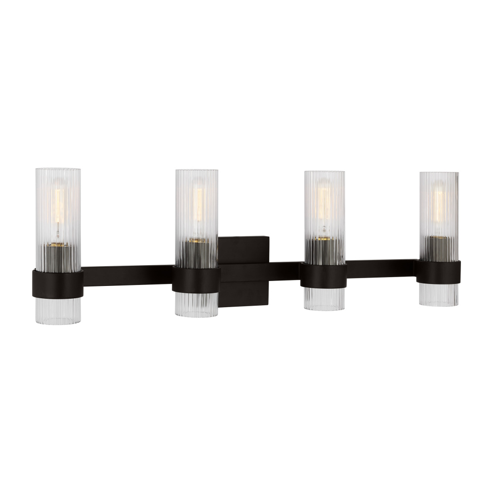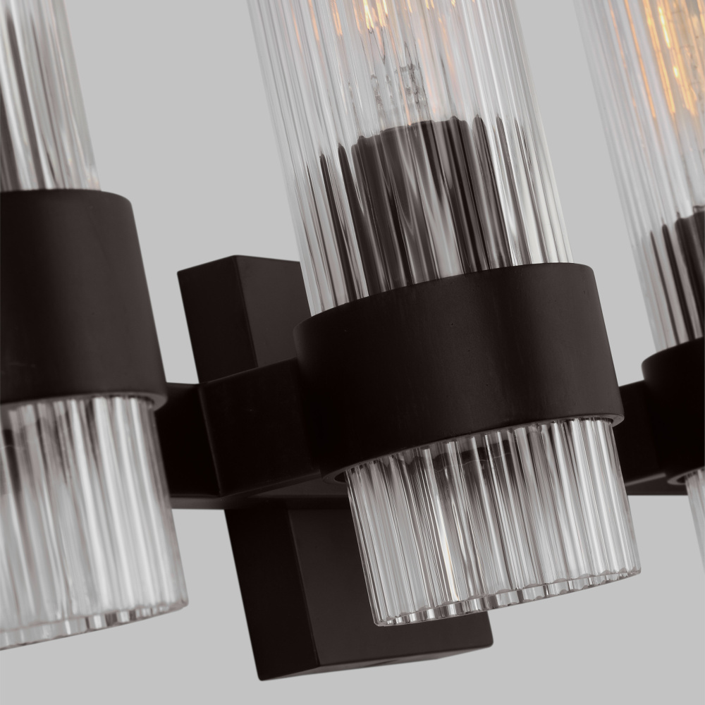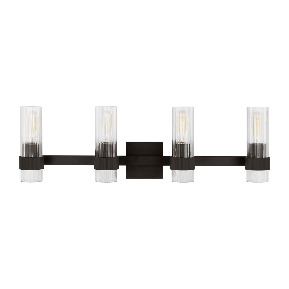 Designed by Chapman & Myers, the Geneva four-light vanity fixture in Aged Iron offers shadow-free lighting in your powder room, spa, or primary bathroom. It is the perfect way to achieve your home's desired fashion or functional needs. A fluted shade forms an elegant, dynamic silhouette balanced by a strong frame of Aged Iron, Burnished Brass, or Polished Nickel.