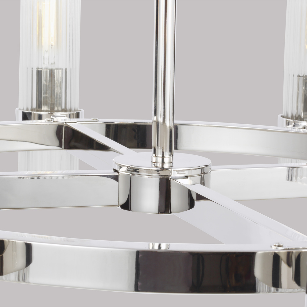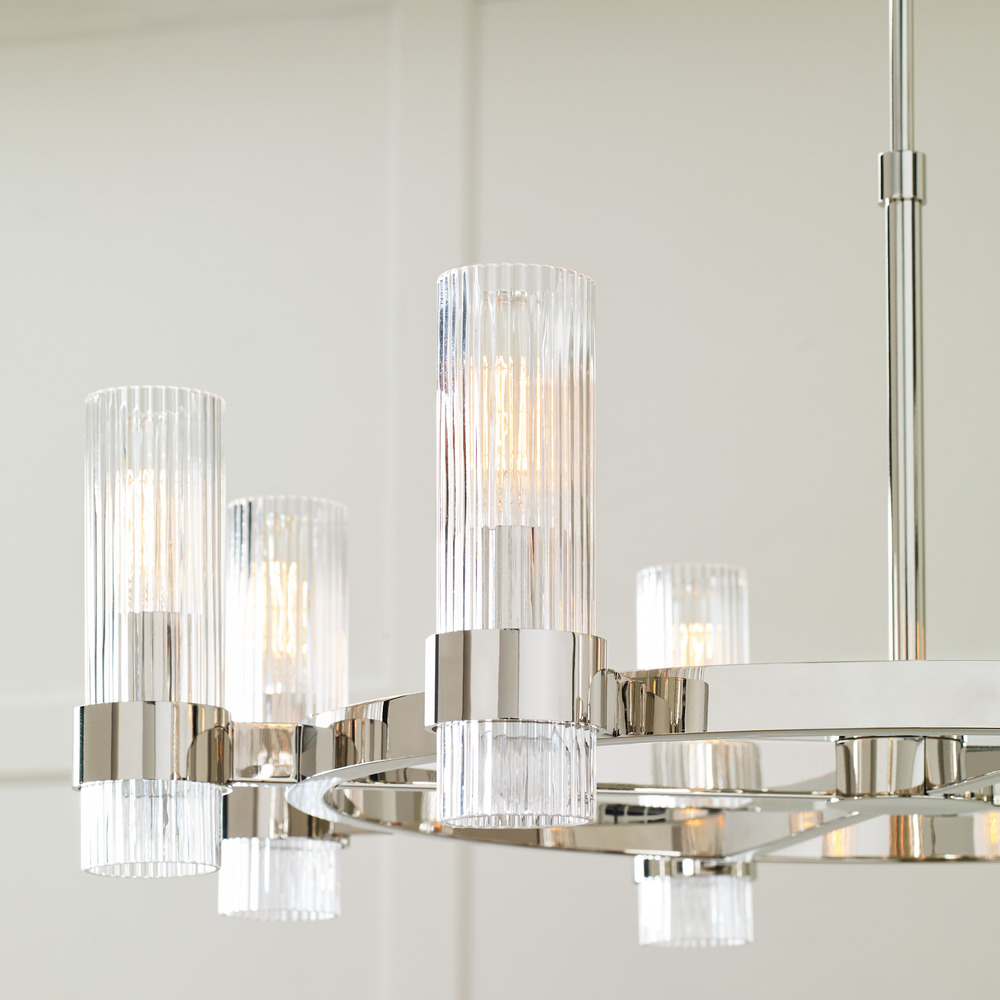 In the Geneva eight light single tier chandelier, slender fluted shades form an elegant, dynamic silhouette that's balanced by a strong frame of Burnished Brass or Polished Nickel.
