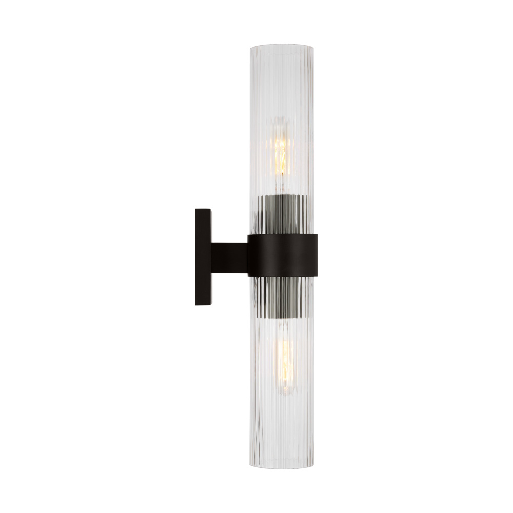 Designed by Chapman & Myers, the Geneva two-light vanity fixture in Aged Iron is the perfect way to achieve your home's desired fashion or functional needs. A fluted shade forms an elegant, dynamic silhouette balanced by a strong frame of Aged Iron, Burnished Brass, or Polished Nickel.