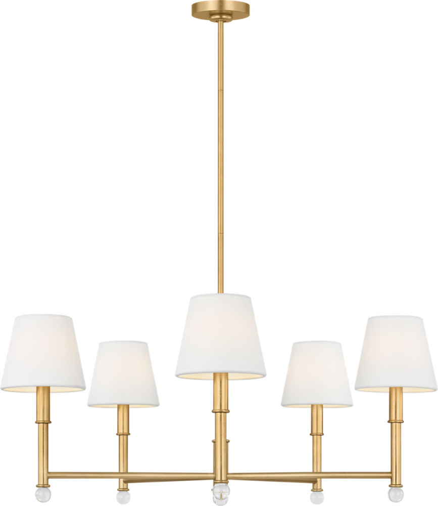 The Greard 33" Chandelier by Alexa Hampton captures the essence of the collection’s elevated and refined aesthetic in a mid-sized form. Suspended With poise, its natural linen shades diffuse light With warmth, while the clear decorative ball detail adds a subtle layer of glamour. This chandelier's balanced 33" profile is ideal for bedrooms, foyers, breakfast nooks, and smaller dining areas, offering a sculptural presence that complements both contemporary and transitional interiors. Its sleek silhouette and quiet sophistication reflect Hampton’s modern take on traditional design.