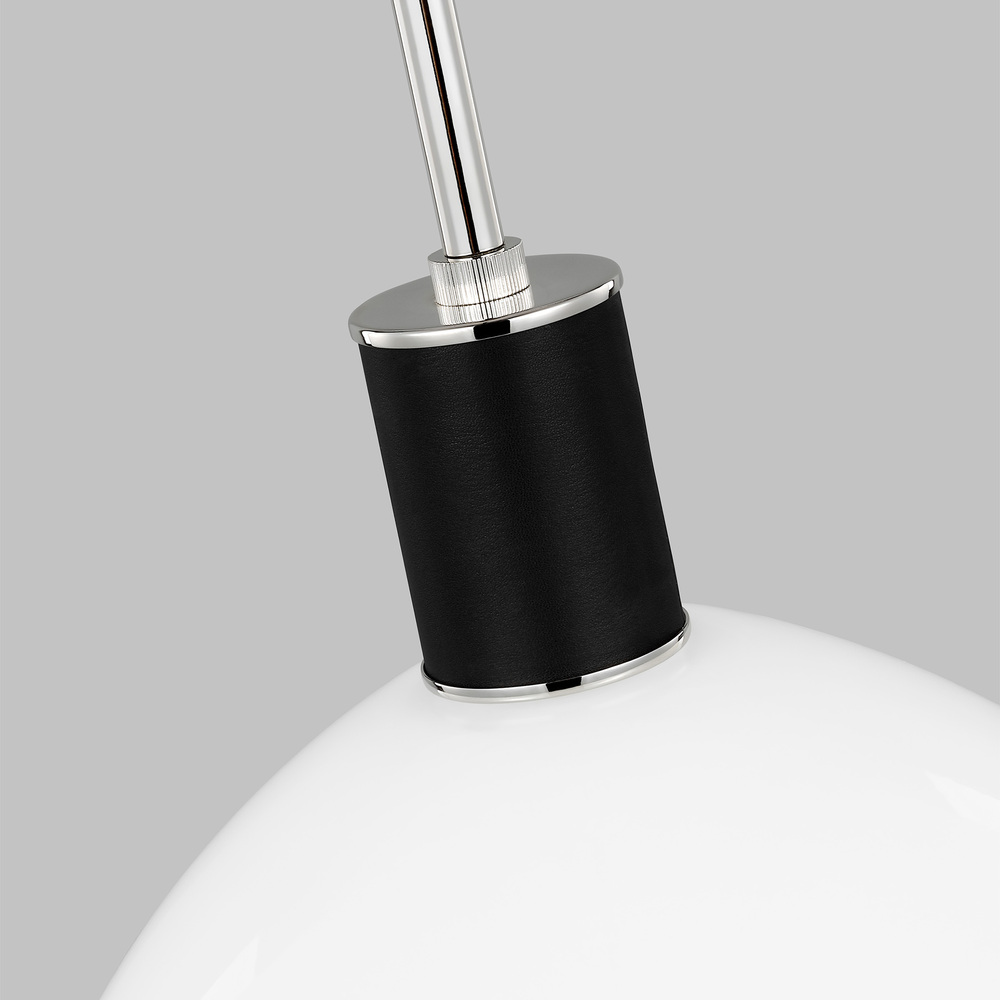 A single bulb is suspended through a frosted glass shade and accented with a black leather band.