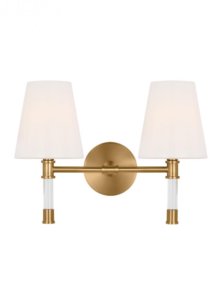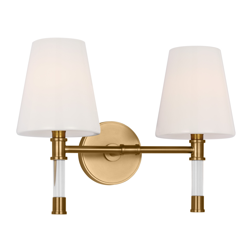 In the Hanover two-light wall vanity, Lucite arms form an elegant, dynamic silhouette that stems from a hub of either Burnished Brass and Polished Nickel finish and extends to matching color candle tubes, topped with exposed candelabra bulbs. Round backplate.