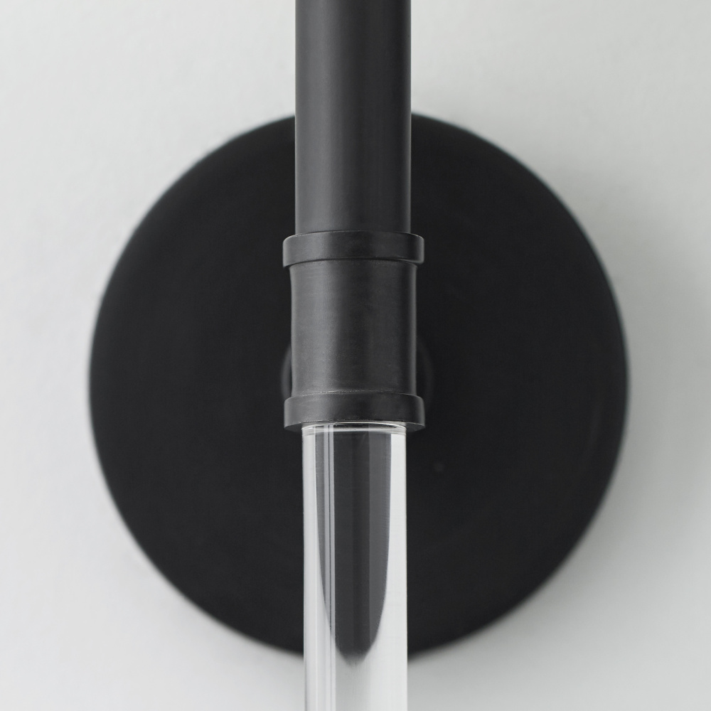 In the Hanover one-light wall sconce, a Lucite arm forms an elegant, dynamic silhouette that stems from a hub of either Burnished Brass and Polished Nickel finish and extends to matching color candle tubes, topped with exposed candelabra bulbs. Round backplate.