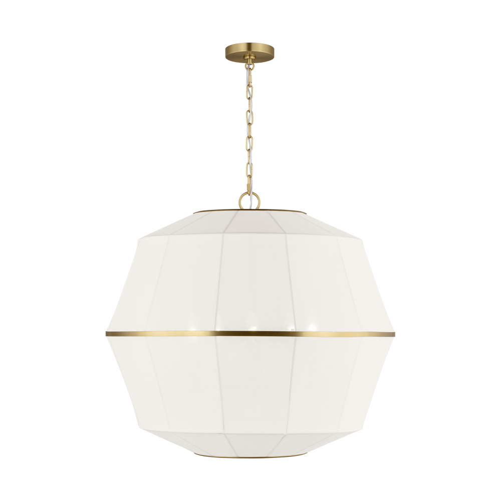 Showcasing multifaceted geometry, the Hikari series by Ellen DeGeneres is inspired by her personal collection of sculptural lighting. Grounded by the contrast of hard and soft materials, the aged iron and white linen fixture radiates soft, diffused light. The Hikari pendant can be used in a dining room, living room, bedroom or entryway.