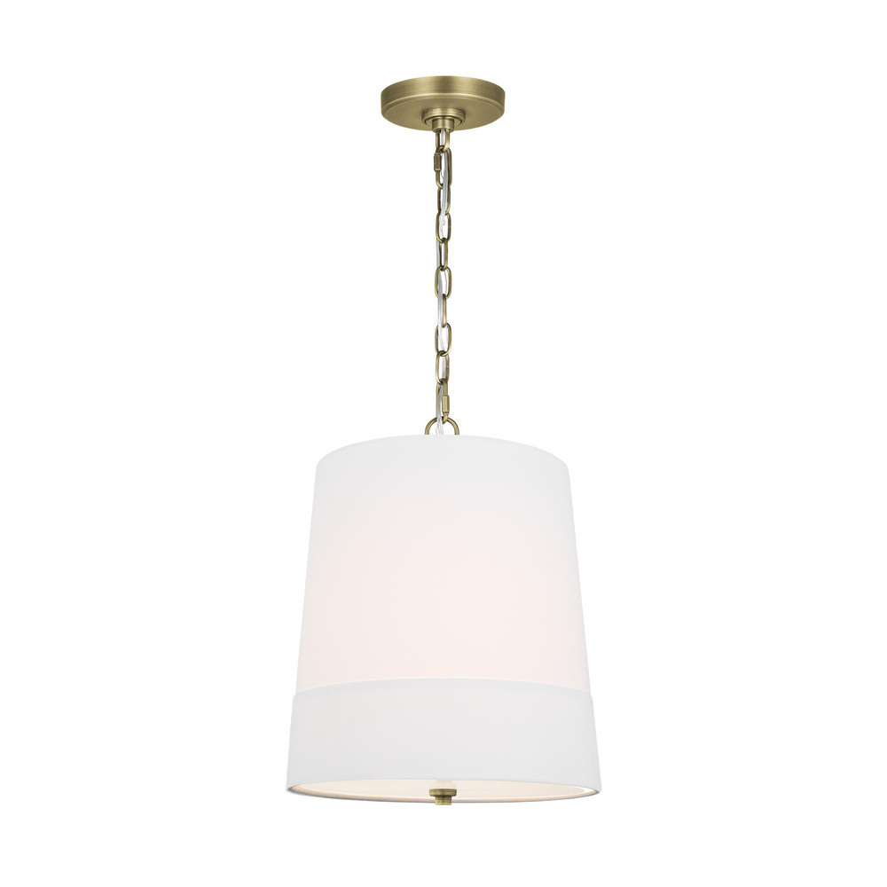 Ivie by Lauren Ralph Lauren is a modern, preppy hanging shade collection that has nautical appeal which gives it a coastal east coast Hamptons vibe. The sleek, fabric shades and etched glass diffusers of the Ivie shade pendant combine to create a warm glow. Finished-off with decorative metal finials to secure the etched glass diffusers in place, these fixtures convey a tailored look while creating both ambient and task lighting. The assortment includes a tall, medium and wide pendant all with classic drum shades, and all are offered in a Time Worn Brass finish. Both incandescent lamping and ENERGY STAR-qualified LED lamping are available; all fixtures are California Title 24 compliant.