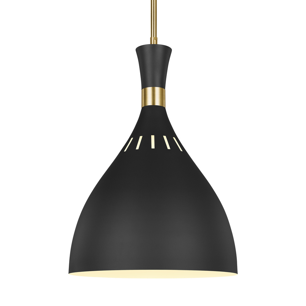 The Joan one light indoor pendant in midnight black provides abundant light to your home, while adding style and interest. Pairing a rich, two-tone finish with bold, geometric lines give Joan luxe appeal. Warm Burnished Brass joins with either Midnight Black or Matte White in a thoughtful juxtaposition of contrasting finishes on the 5-light chandeliers, the 1-light wall sconces and the 1-light table lamps. Each iconic, hourglass-inspired shade features small perforations towards its crown, allowing a soft glow to shine through, further articulating the distinctive details of this chic collection.