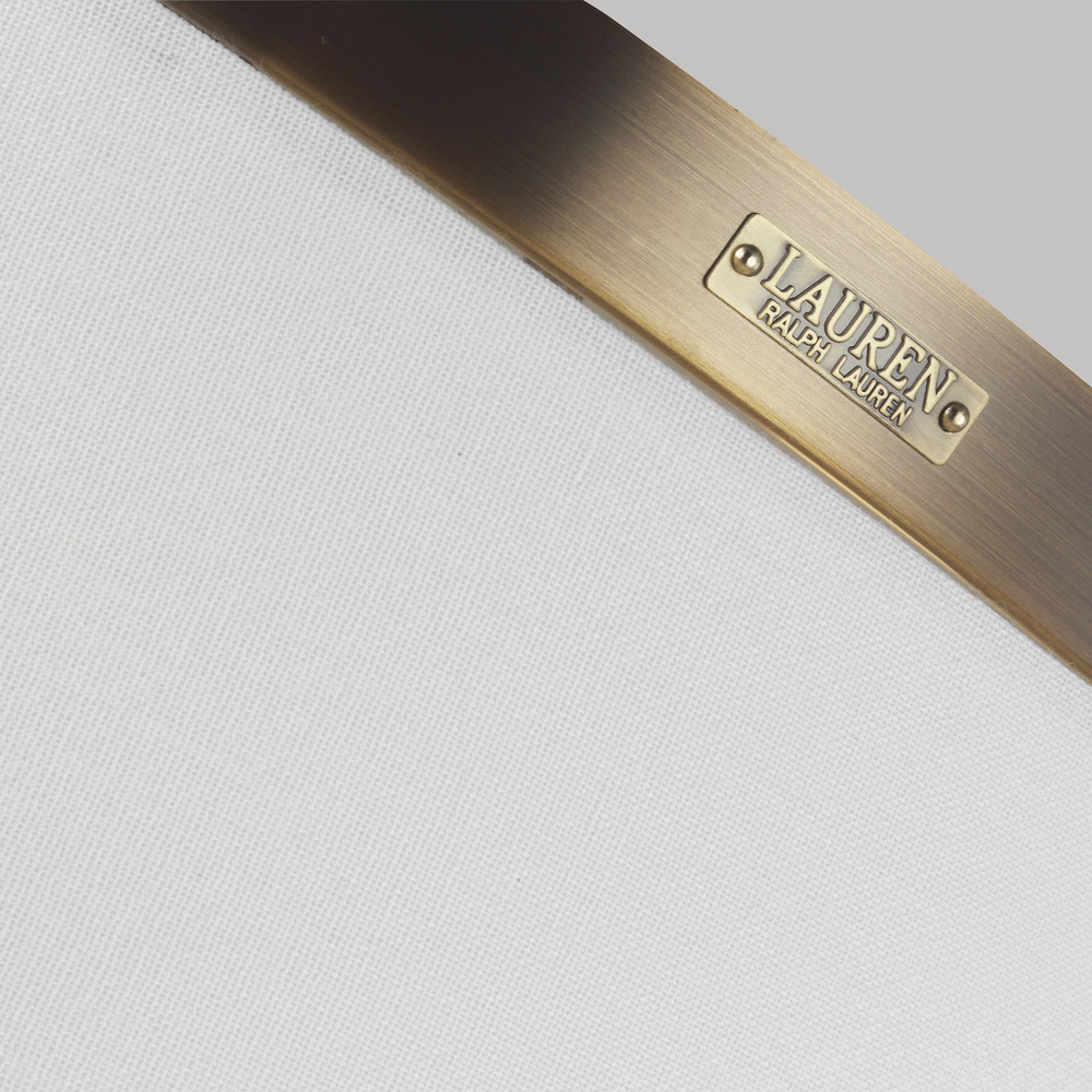 The Katie two light flush mount fixture in time worn brass features a leather stirrup stemming from a milk white glass diffuser and white linen fabric shade.