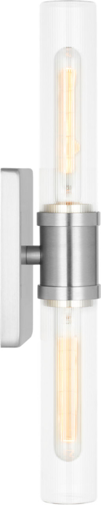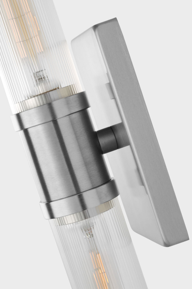 Sleek and modern, this 2-Light bath series pairs a square backplate With tubular clear fluted glass shade. The Keaton two light vanity fixture provides abundant light for your bath vanity, while adding a layer of today's style to your interior design.