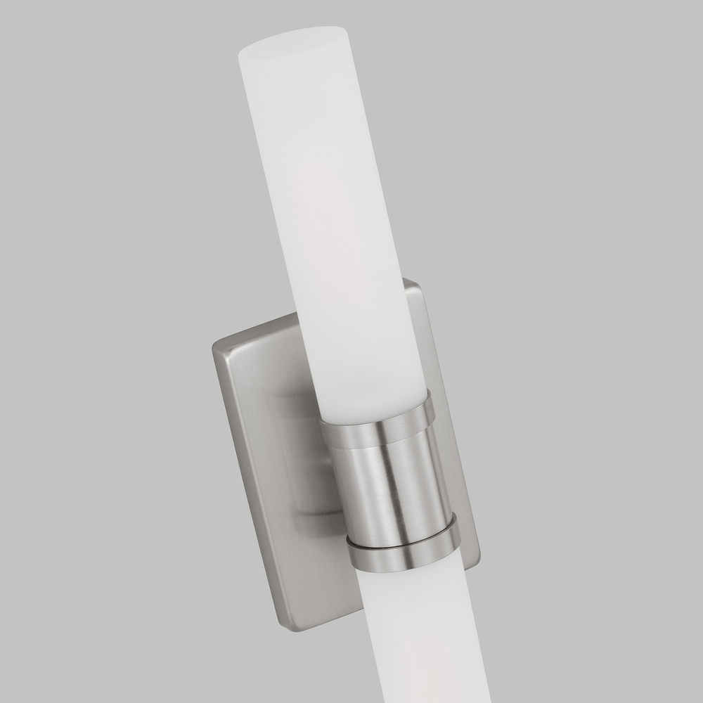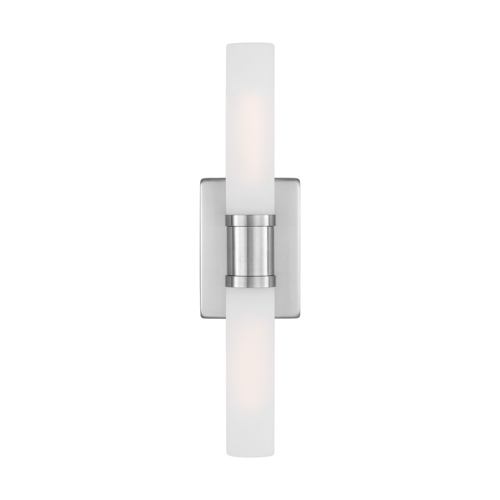 Sleek and modern, this 2-Light bath series pairs a square backplate with tubular etched white opal glass shade. The Keaton two light vanity fixture in brushed nickel silver provides abundant light for your bath vanity, while adding a layer of today's style to your interior design.