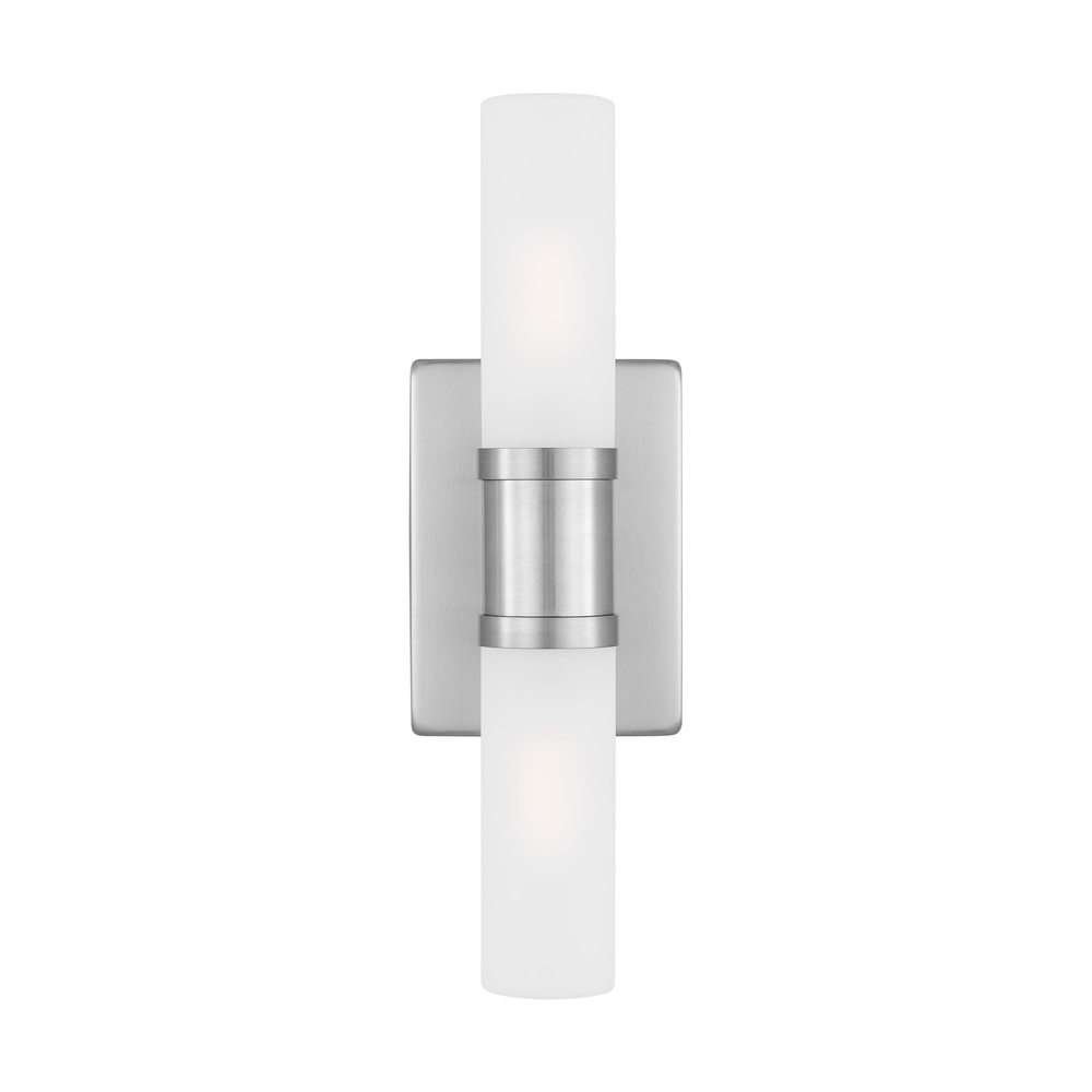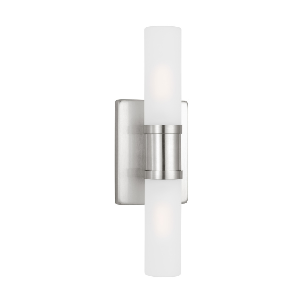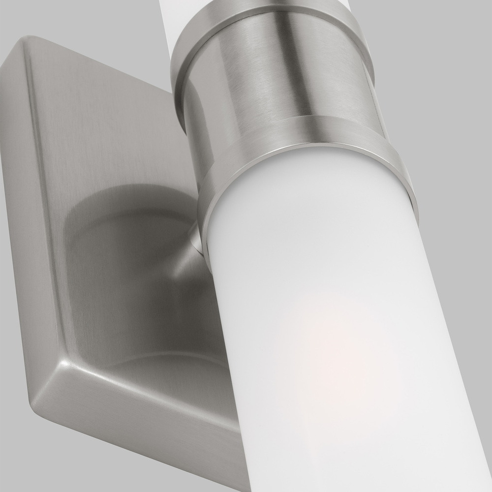 Sleek and modern, this 2-Light bath series pairs a square backplate with tubular etched white opal glass shade. The Keaton two light vanity fixture in brushed nickel silver provides abundant light for your bath vanity, while adding a layer of today's style to your interior design.