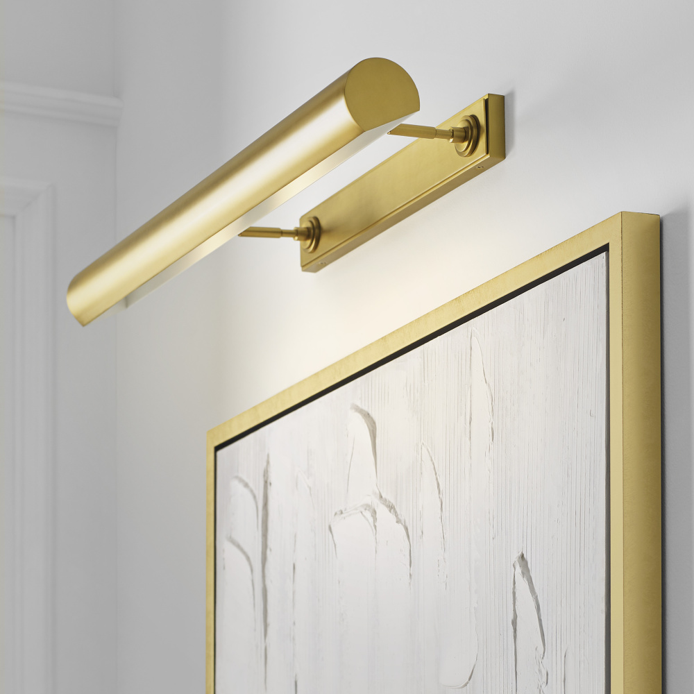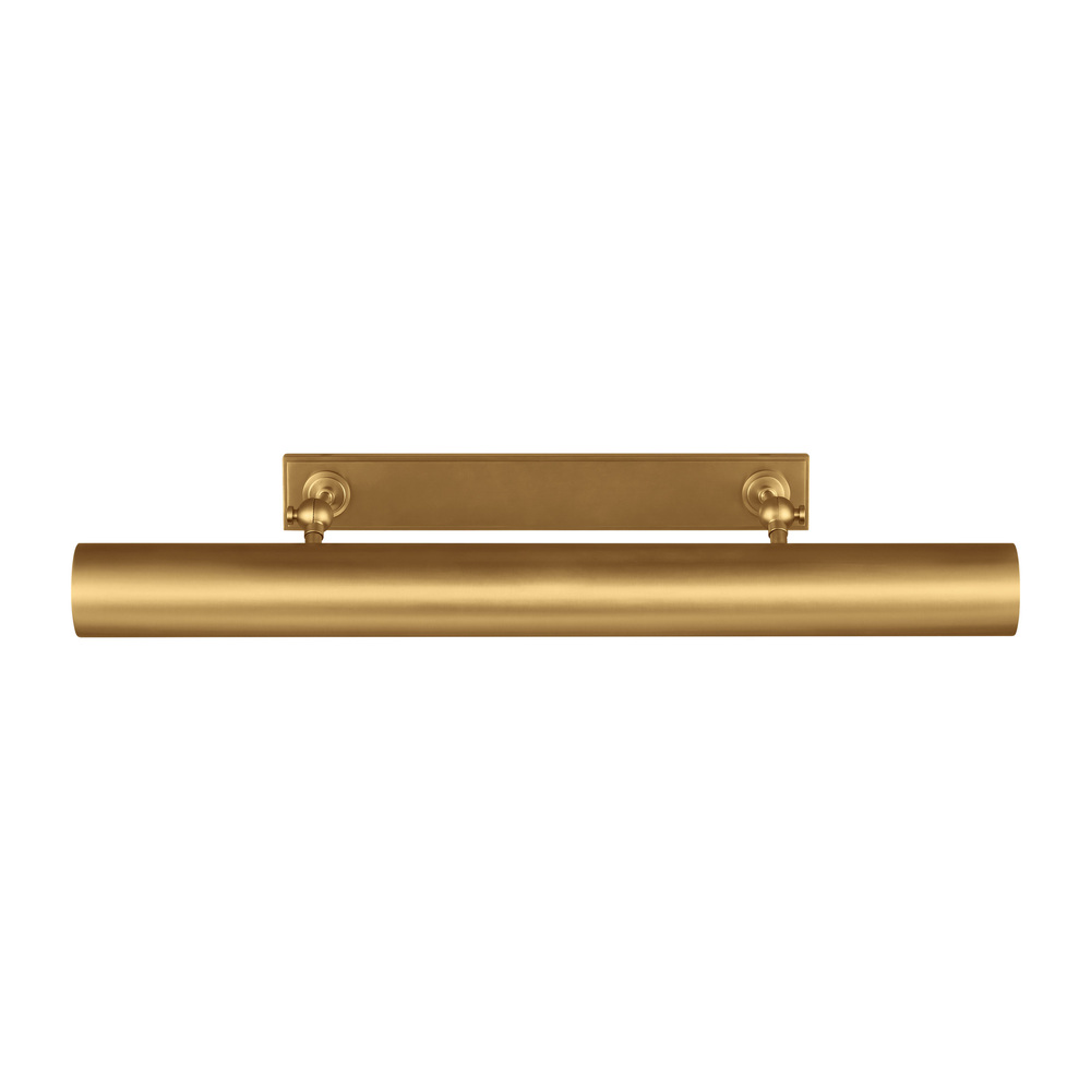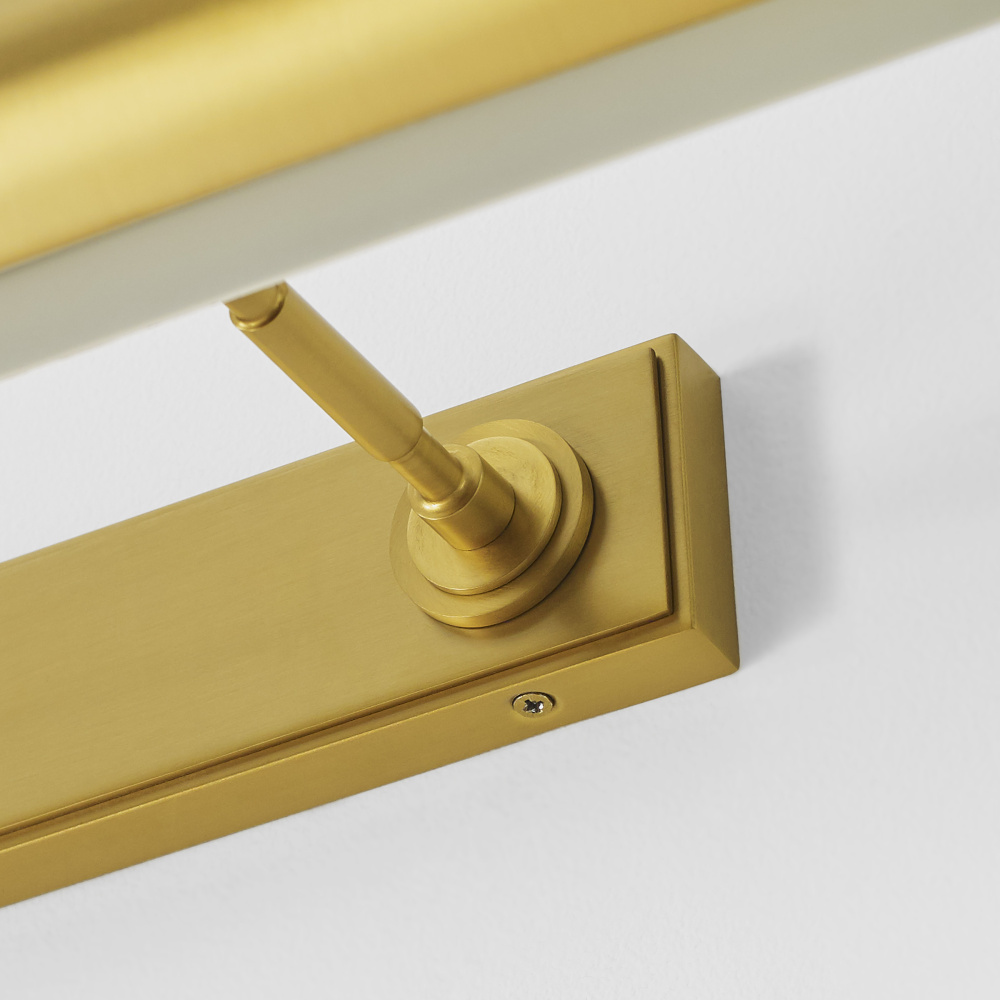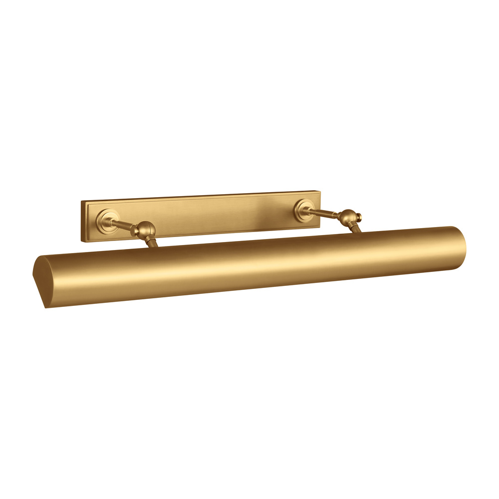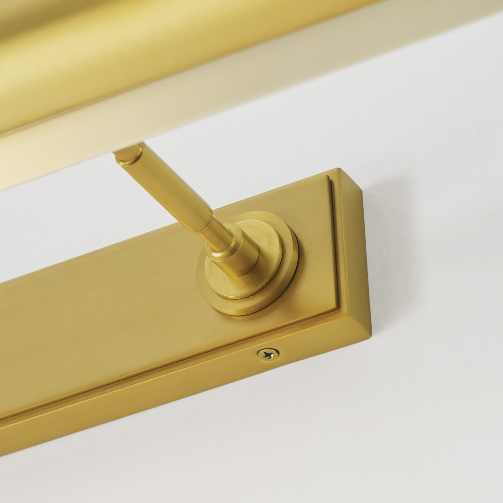 The Kenyon 30" Picture Light by Chapman & Myers were designed to be highly versatile in their application, at home in any interior. They have classic half round pharmacy shades which are mounted to a cylindrical metal stem with a differentiated stepped detailing. The picture lights have an architecturally inspired medallions where the arms mount to the rectangular backplate. Kenyon has a smooth clean metal shade that will bring the perfect light to your works of art. Available finishes include Aged Iron and Burnished Brass.