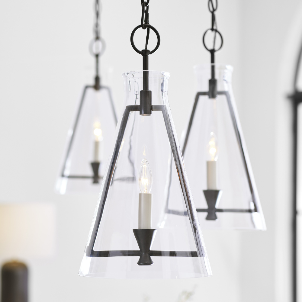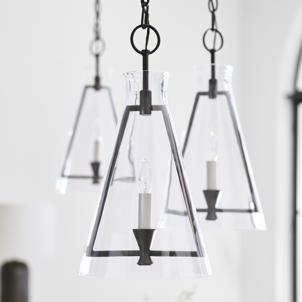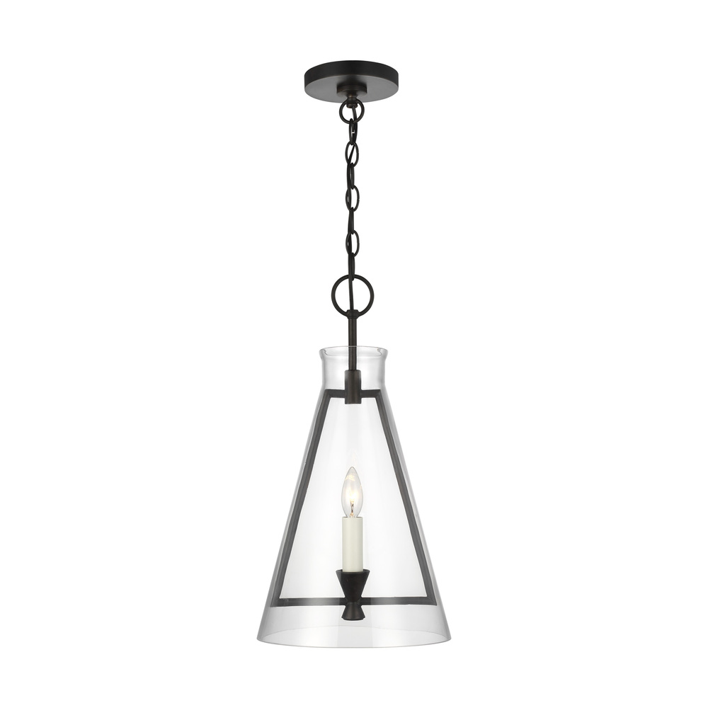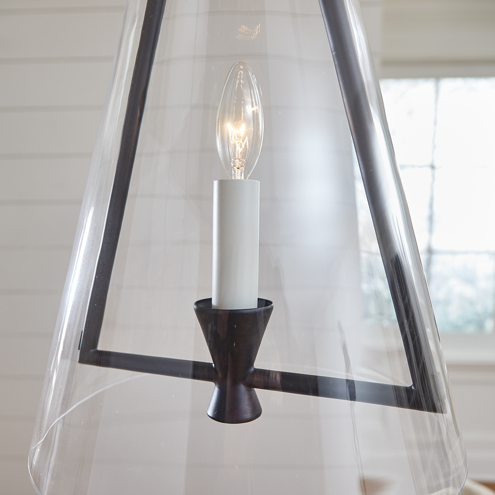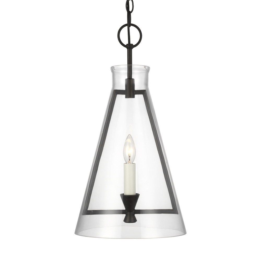 The Keystone one light indoor pendant casts a warm and inviting glow with its candelabra, set within an angular, Aged Iron frame and quarter inch thick clear glass. This series of chandeliers, sconces and pendants designed by Chapman & Myers for Visual Comfort Studio features very detailed construction including bobeches supporting each candle tube. The candle cup is based on a totem shape candle created by Alberto Giacometti and the frame is a re-interpretation of a one of Diego Giacometti’s hanging sculptures.