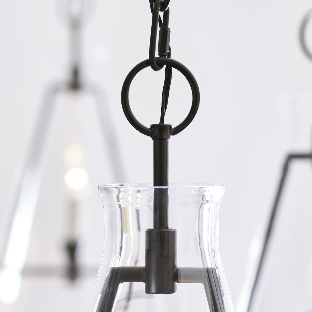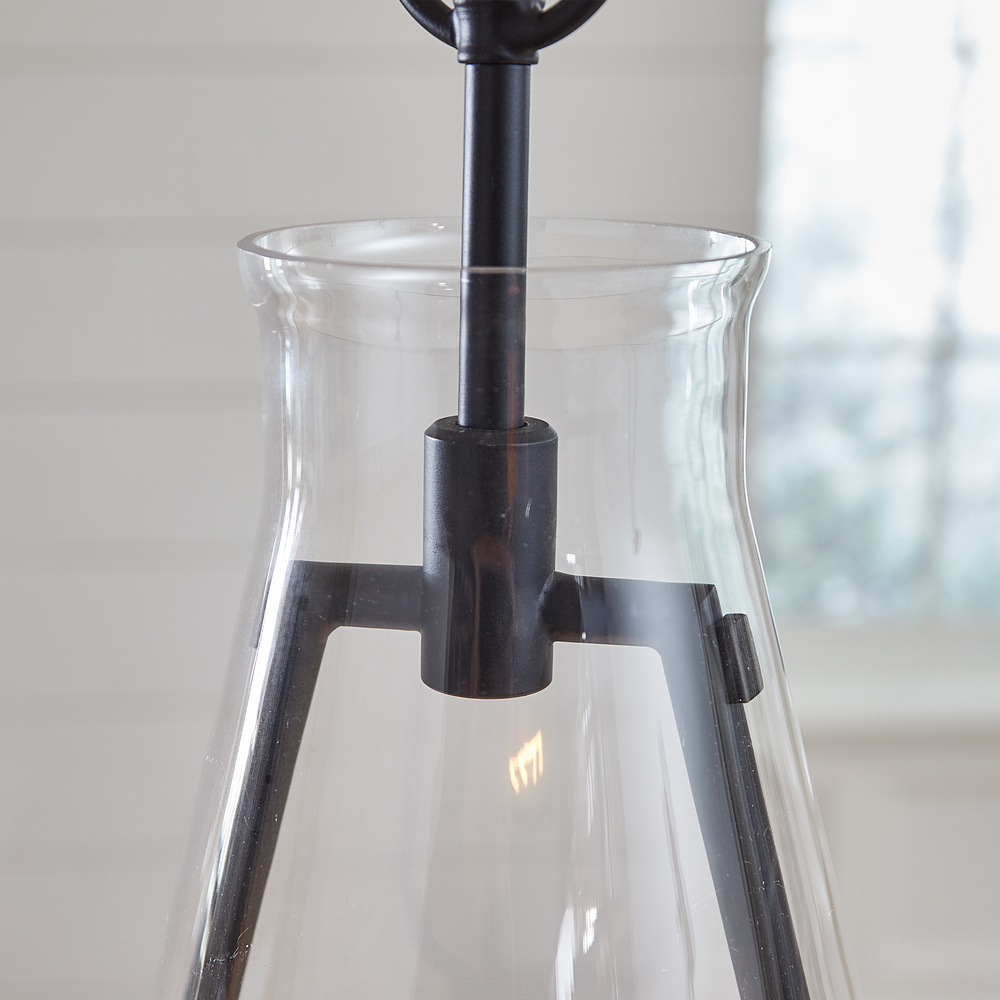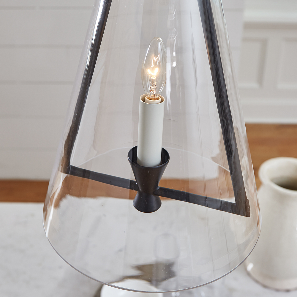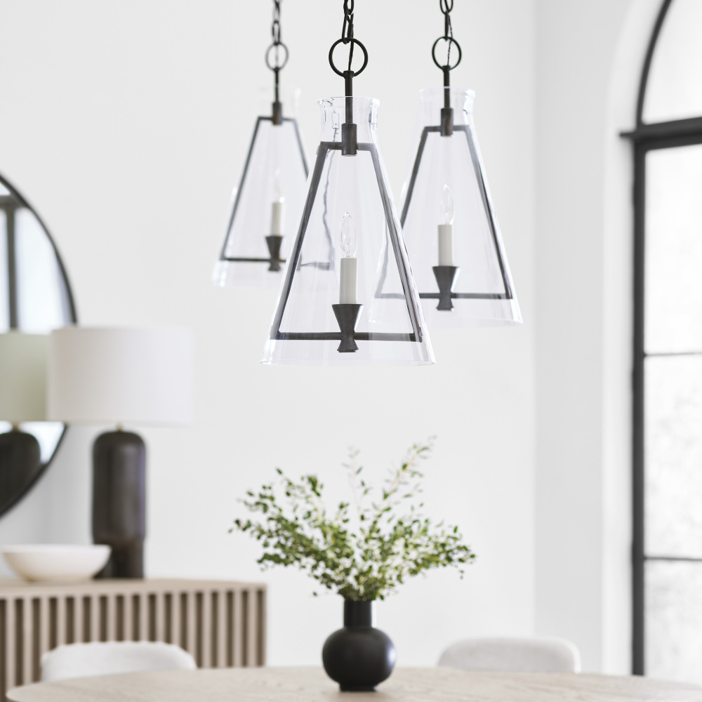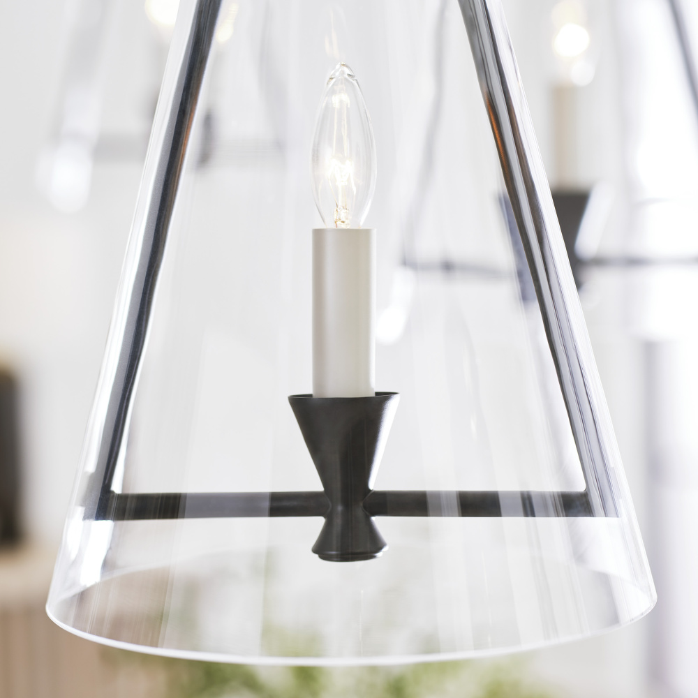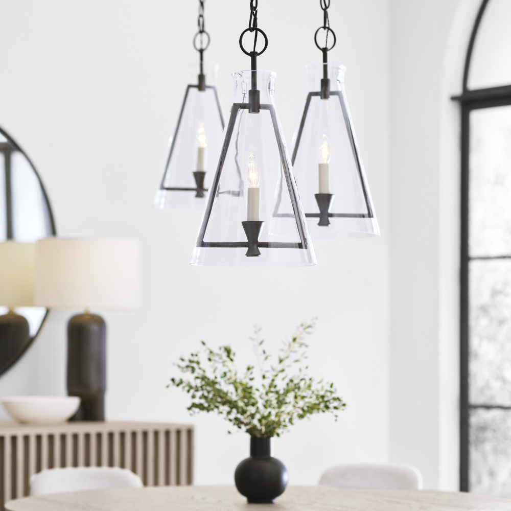 The Keystone one light indoor pendant casts a warm and inviting glow with its candelabra, set within an angular, Aged Iron frame and quarter inch thick clear glass. This series of chandeliers, sconces and pendants designed by Chapman & Myers for Visual Comfort Studio features very detailed construction including bobeches supporting each candle tube. The candle cup is based on a totem shape candle created by Alberto Giacometti and the frame is a re-interpretation of a one of Diego Giacometti’s hanging sculptures.