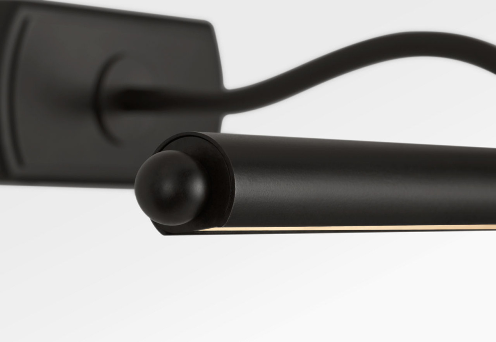 The Lamont 19" Picture Light by Chapman & Myers brings sleek minimalism to smaller-scale applications. Defined by the collection’s ultra-slim shade and integrated LED technology, it offers clean, focused illumination that enhances without overpowering. Mounted to an elegant S-shaped arm and finished With ball finial end caps, the 19" profile is ideal for hallways, studies, or gallery walls—where its refined proportions and architectural clarity highlight artwork or shelving With quiet sophistication. As part of Chapman & Myers’ slimmest picture light collection, it’s designed to complement its surroundings while keeping the focus on what matters most.