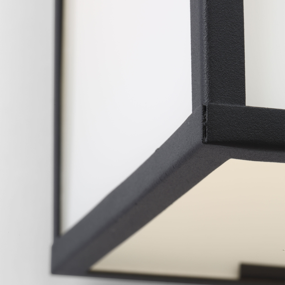Modern exterior fixture will complement outdoor areas such as garage entries, sheds, or patios