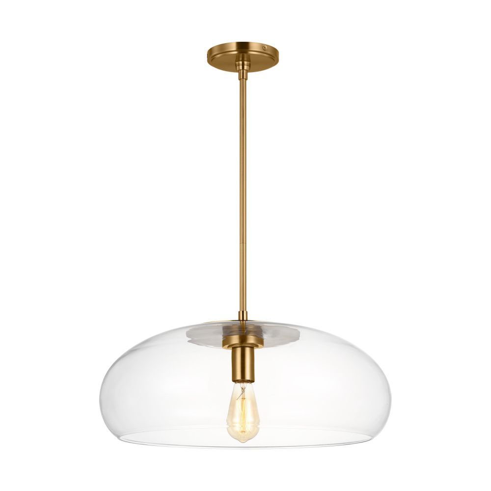 Designed by Thomas O'Brien, Largo is inspired by a 1960’s Danish ceramic dish turned upside down. Crafted from steel, Largo offers a signature focal point with a single lamp suspended downward from the center. A hint of Burnished Brass peeks through the Clear glass, becoming the fixture's central design element. The Largo pendants may be installed as single pendants or clustered in multiples, which would be an ideal installation for entry, dining room, living room, or kitchen lighting over a table. In addition to being damp-rated, the pendant can be mounted on a sloped ceiling.