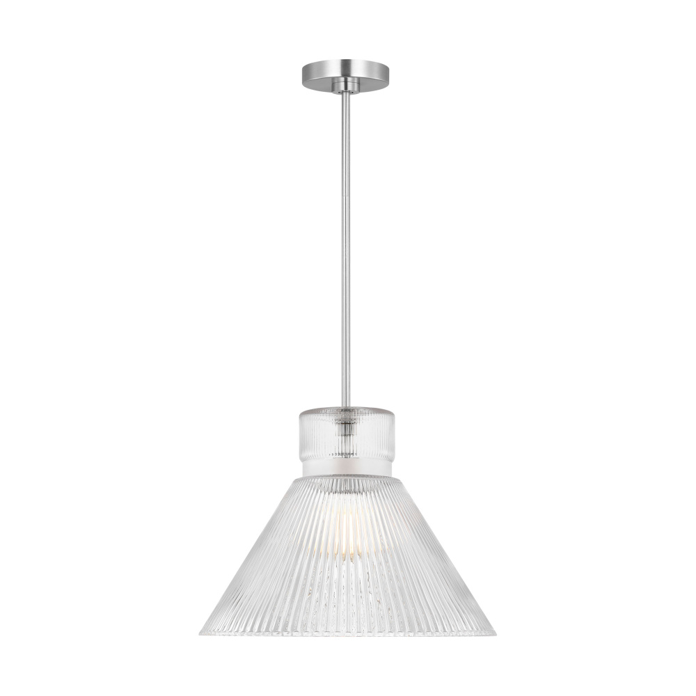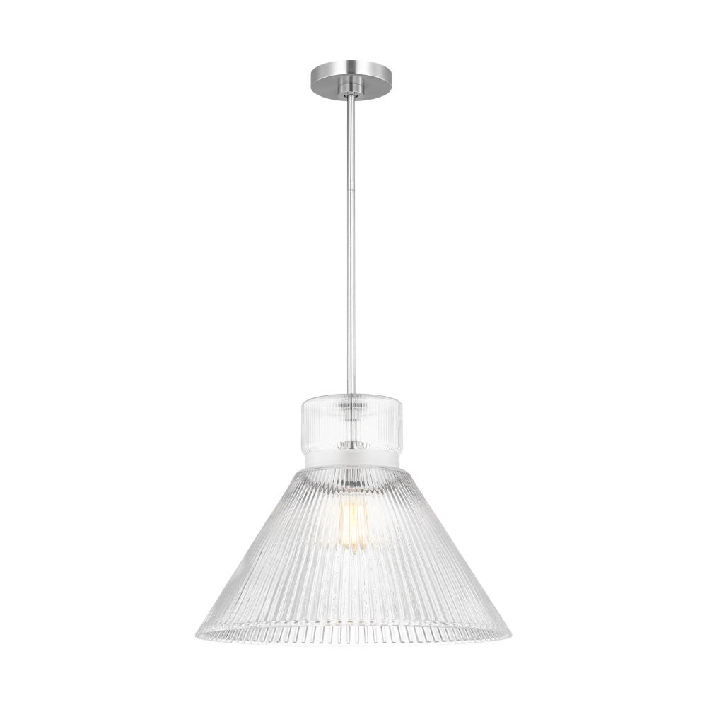 Crafted with Steel in a Brushed Nickel finish with clear ribbed glass shade