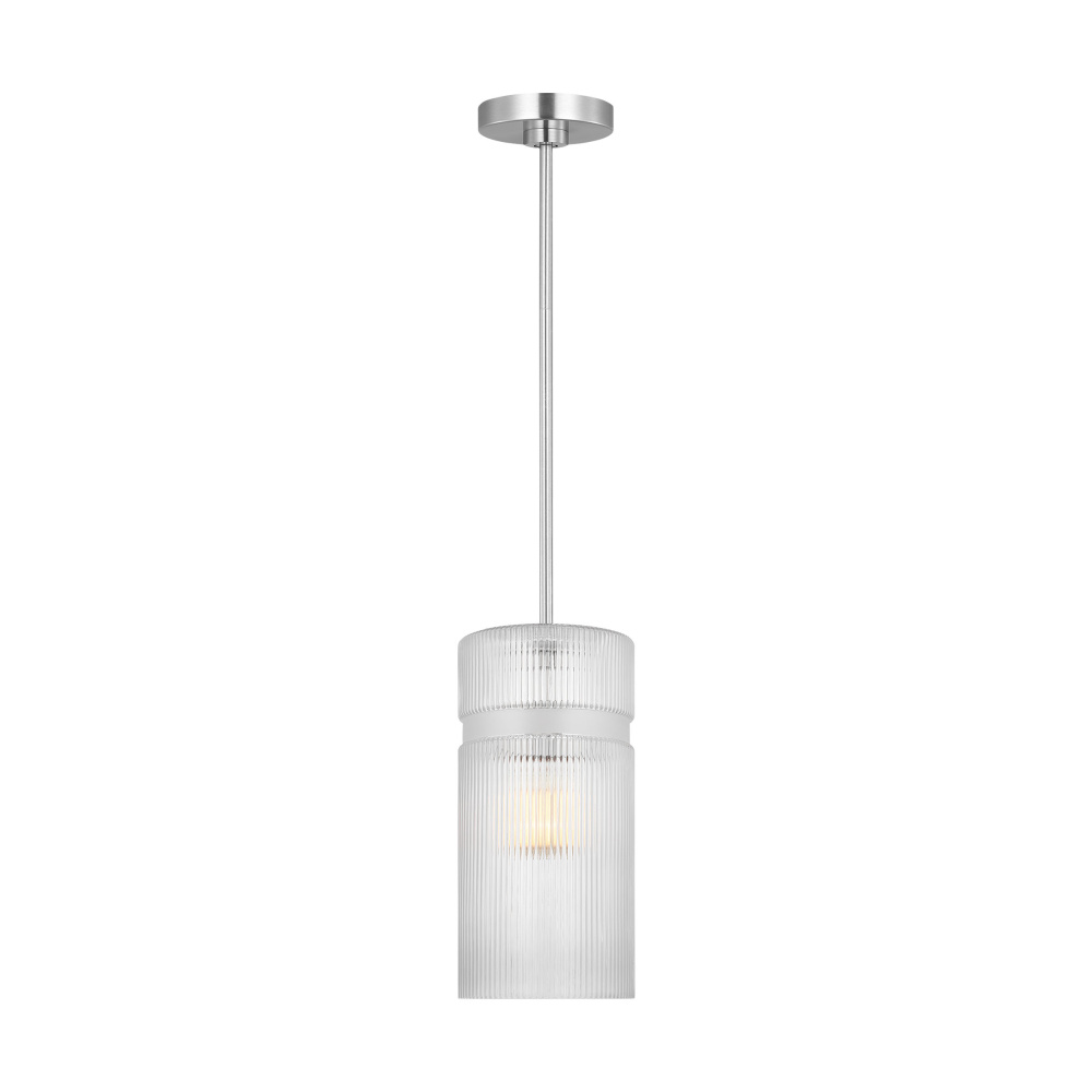 Crafted with Steel in a Brushed Nickel finish with clear ribbed glass shade