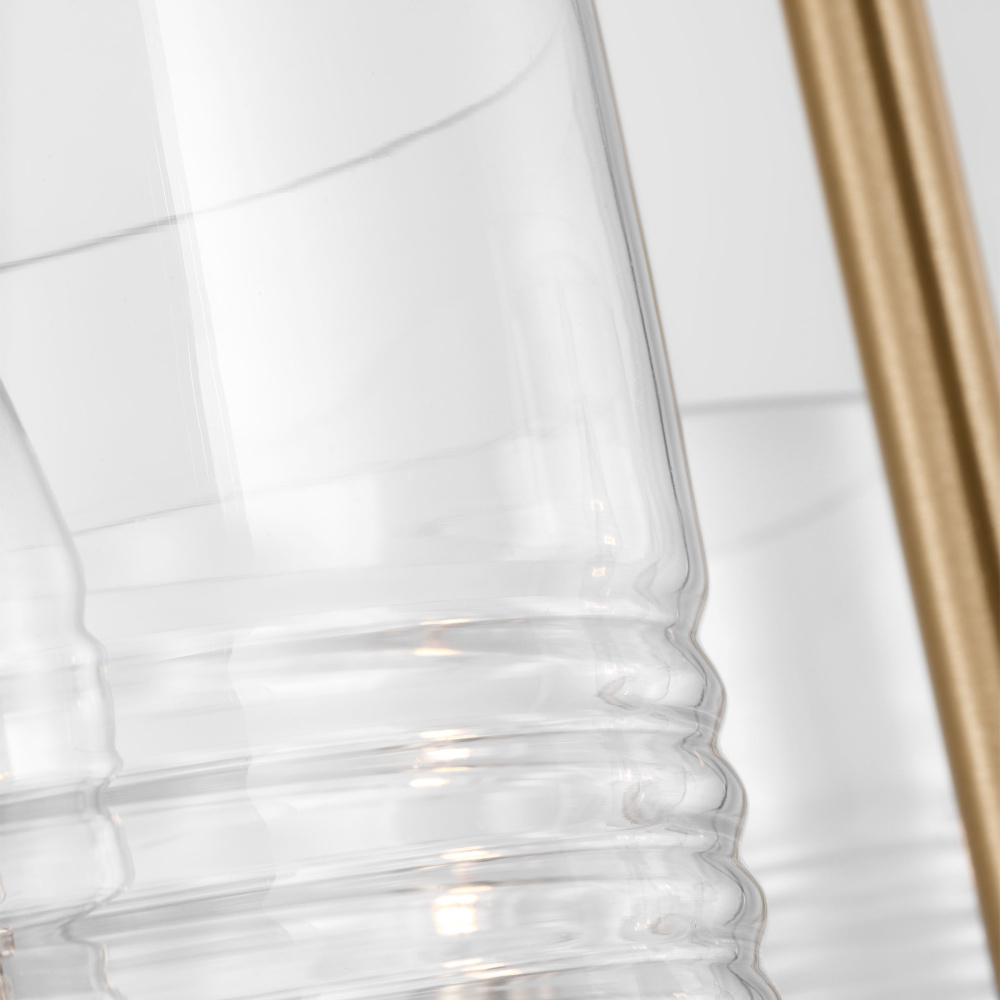 Crafted with Steel in a Satin Brass finish with clear ribbed glass shades