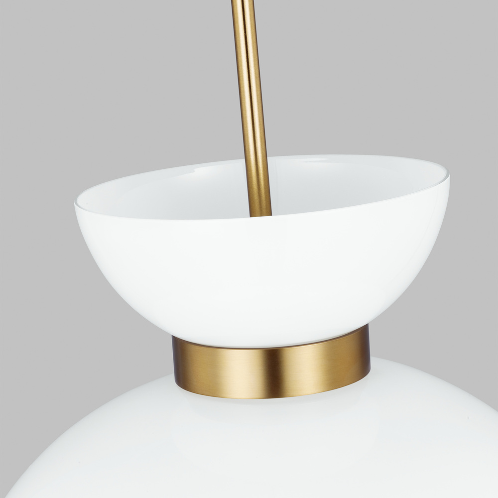 Londyn is inspired by geometric playful midcentury fixtures in metal and glass with exciting profiles and scale play. Two glass spheres with a simple metal cuff and a single bulb—an elegant pendant with graphic interest. This pendant would be great as a single or in multiples over a kitchen island.