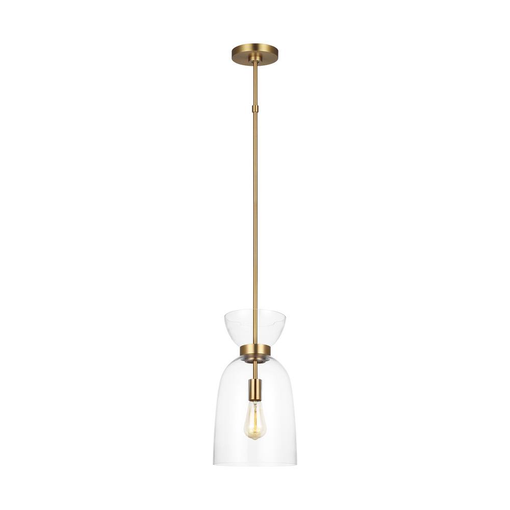 Londyn is inspired by geometric playful midcentury fixtures in metal and glass with exciting profiles and scale play. Two glass spheres with a simple metal cuff and a single bulb—an elegant pendant with graphic interest. This pendant would be great as a single or in multiples over a kitchen island.