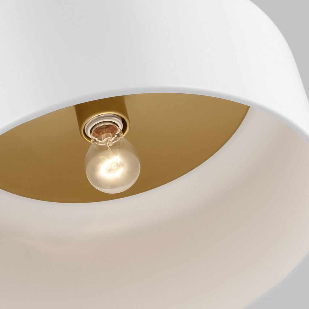 The Malone collection features a youthful color palette and simple detail that really refines the design. The inner part of the shade is highlighted by a beautifully spun-metal disk and socket cover in our warm satin brass finish to create visual interest. Add minimalist chic to your kitchen living room, bedroom or foyer or with this flush-mount fixture, which is as durable as it is beautiful