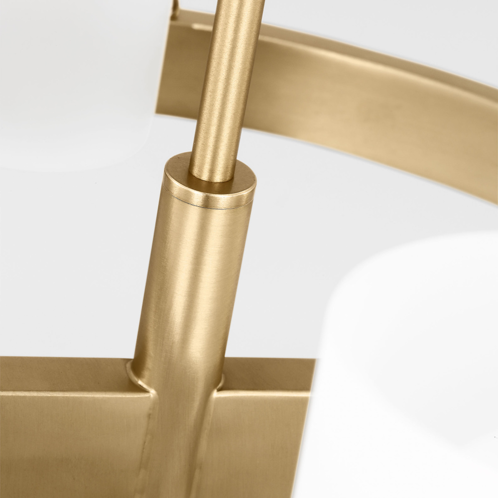 Rhode by Drew & Jonathan is a classic design with clean lines and white milk glass shades, perfect for farmhouse or transitional style settings. It's made from metal, featuring a wagon wheel body on the chandelier and a square backplate on the wall sconce. The overall style and multiple finishes work as well in a modern-farmhouse kitchen as they do in a vintage industrial loft.
