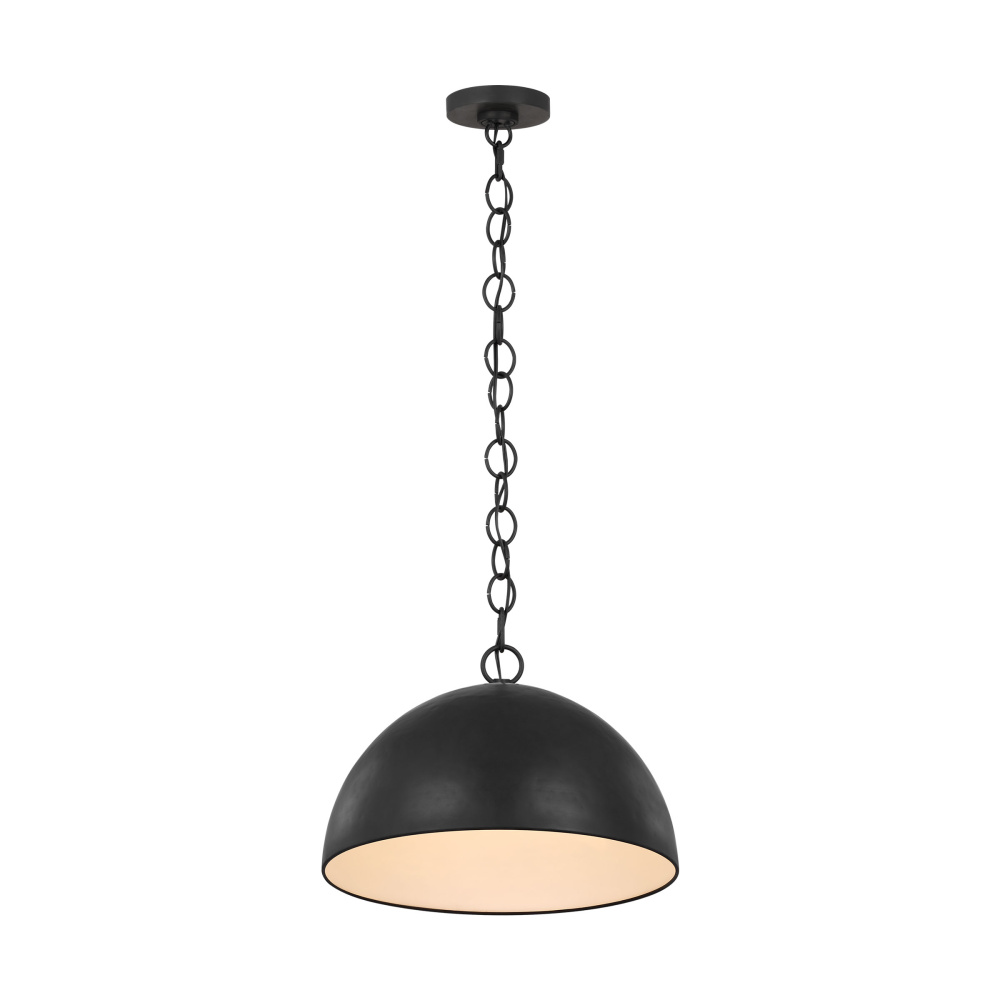 The Whare one light indoor pendant in aged iron provides abundant light to your home, while adding style and interest. Handcrafted of brass and dramatically scaled, our pendant is a statement piece. The rounded industrial form is softened by its hand-hammered texture, and the warm, burnished brass finish reflects light beautifully.