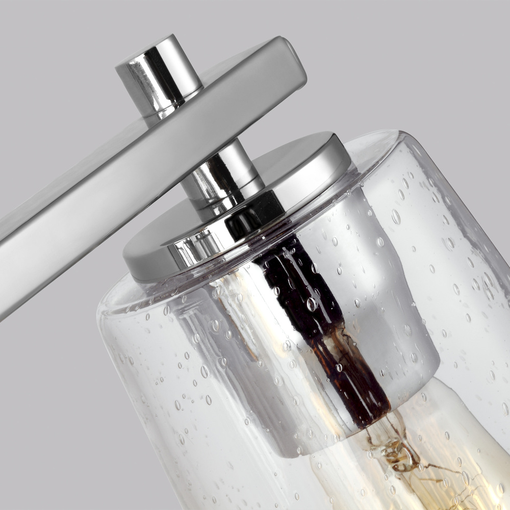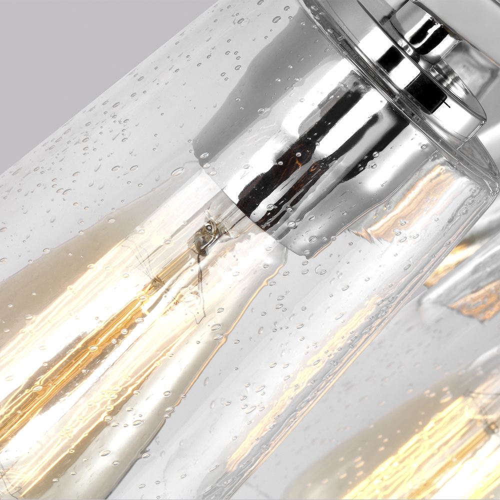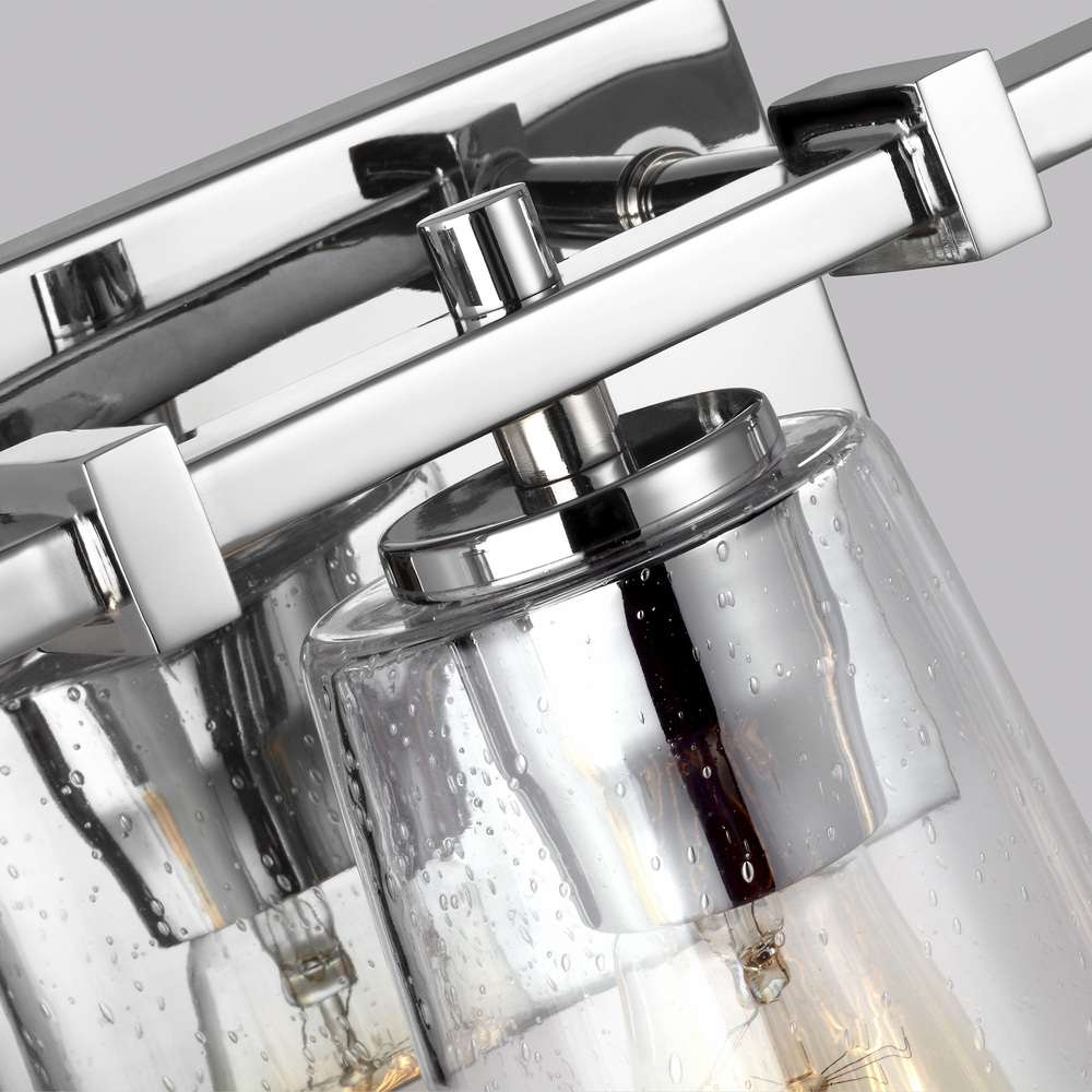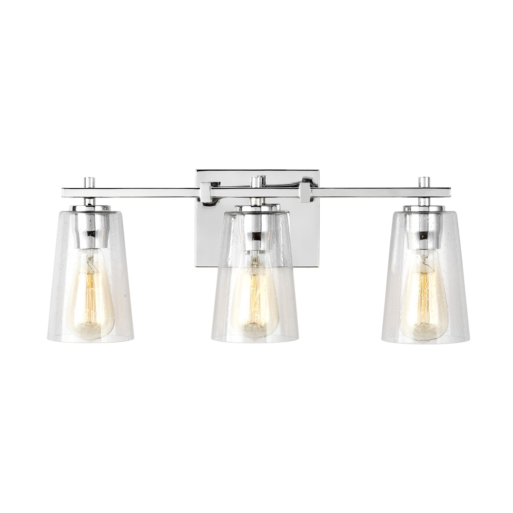 The Sean Lavin Mercer three light vanity fixture in chrome offers shadow-free lighting in your powder room, spa, or master bath room. Modern details, like the clean square supports of the cross arm and sleek, rectangular backplate, are defining features of the Mercer. Choose from either refreshingly bright Chrome or warm, rustic Oil Rubbed Bronze hardware for a distinct look, both with tapered Clear Seeded glass shades that complete the tailored look.
