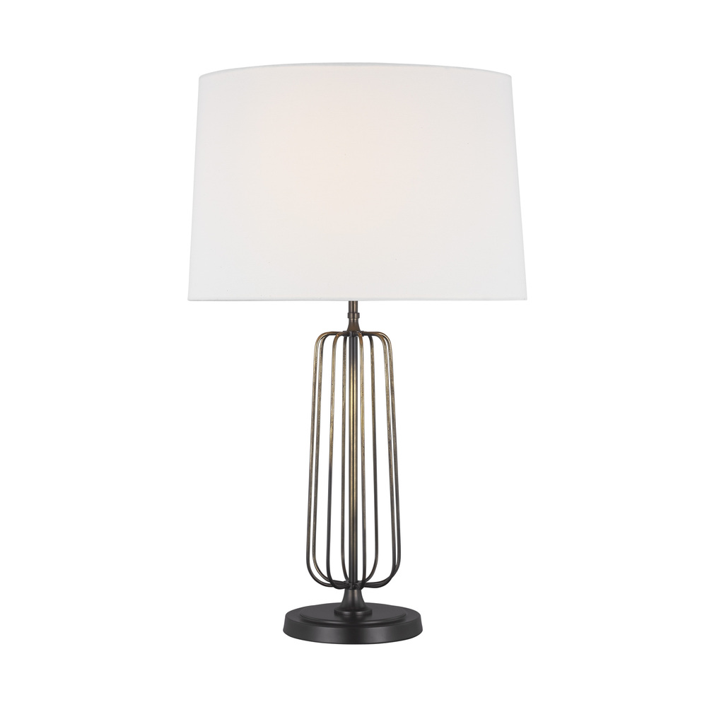 The Milo one light buffet lamp by Thomas O'Brien is plated in brass and features a streamlined openwork silhouette. Each rod that makes up the frame is welded together to form a single silhouette. A hand-painted finish means each piece is unique, with possible slight variations. No two lamps are exactly alike. Available in Atelier Brass finish.