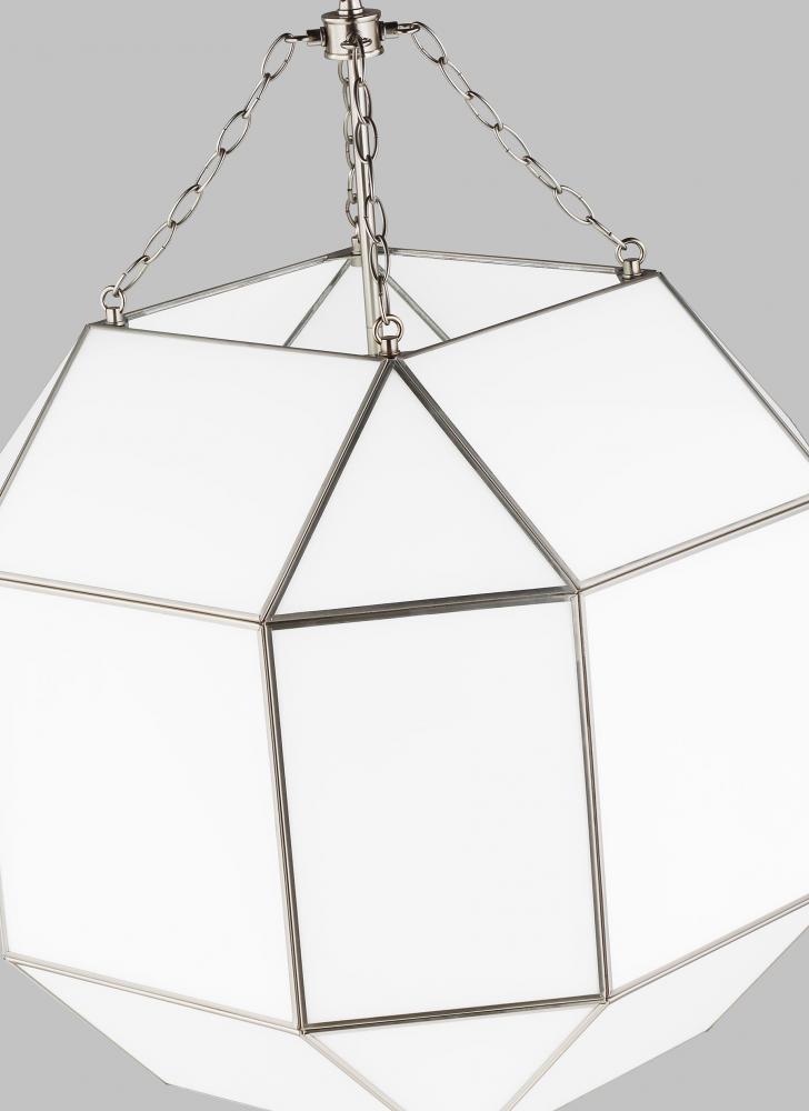 The Morrison four light indoor pendant in brushed nickel provides abundant light to your home, while adding style and interest. A lantern-like design with curved arms connecting to a cube-shaped frame
