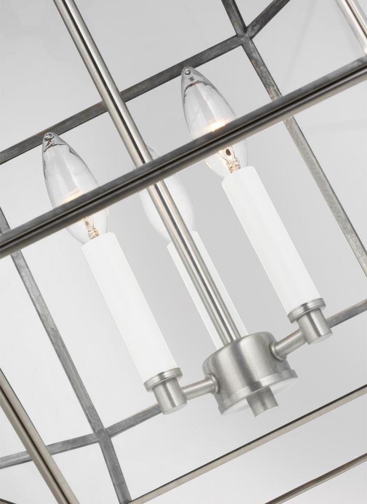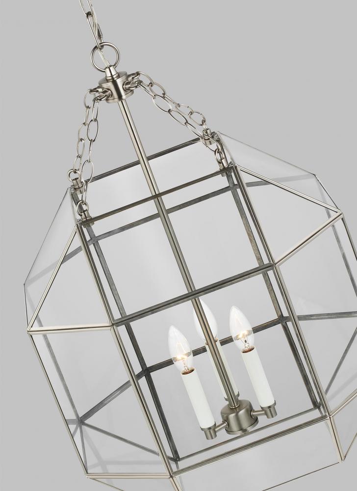 Featuring a lantern-like design with curved arms connecting to a cube-shaped frame, the Morrison pendant series by makes a perfect statement piece over a kitchen counter or dining table. This versatile design comes in Small, Medium or Large Lantern sizes, plus Small and Large Flush Mount. It is available in Clear or White Glass with Antique Nickel, Brushed Nickel or Satin Brass finish. Morrison is supplied with wire pre-laced through chain and sloped ceiling mounting hardware to customize your installation.