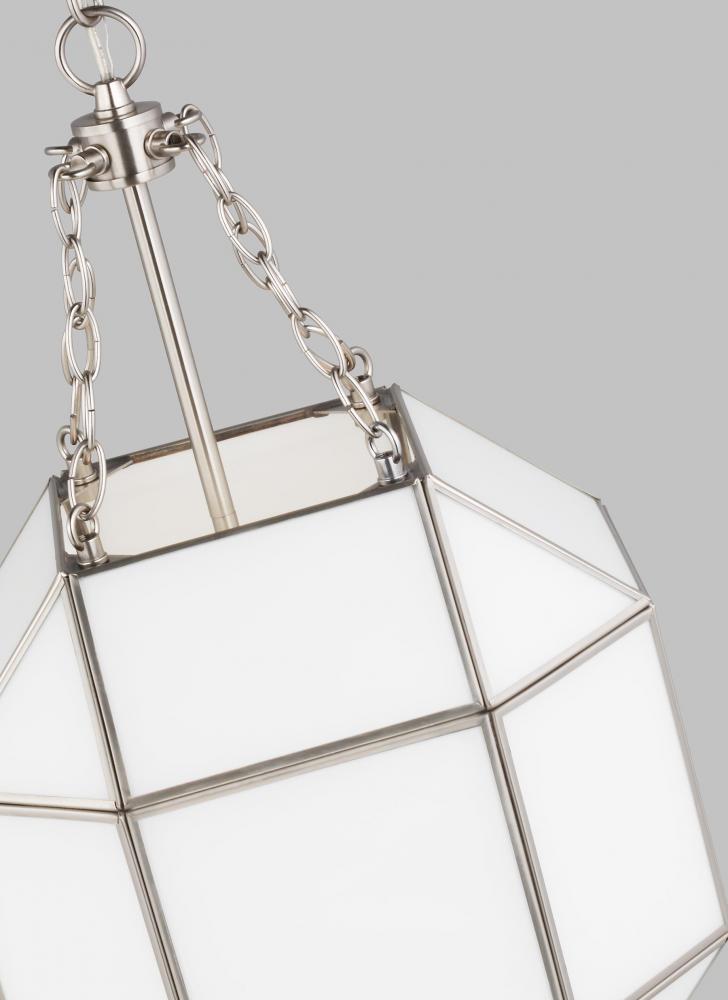 Featuring a lantern-like design with curved arms connecting to a cube-shaped frame, the Morrison pendant series by makes a perfect statement piece over a kitchen counter or dining table. This versatile design comes in Small, Medium or Large Lantern sizes, plus Small and Large Flush Mount. It is available in Clear or White Glass with Antique Nickel, Brushed Nickel or Satin Brass finish. Morrison is supplied with wire pre-laced through chain and sloped ceiling mounting hardware to customize your installation.