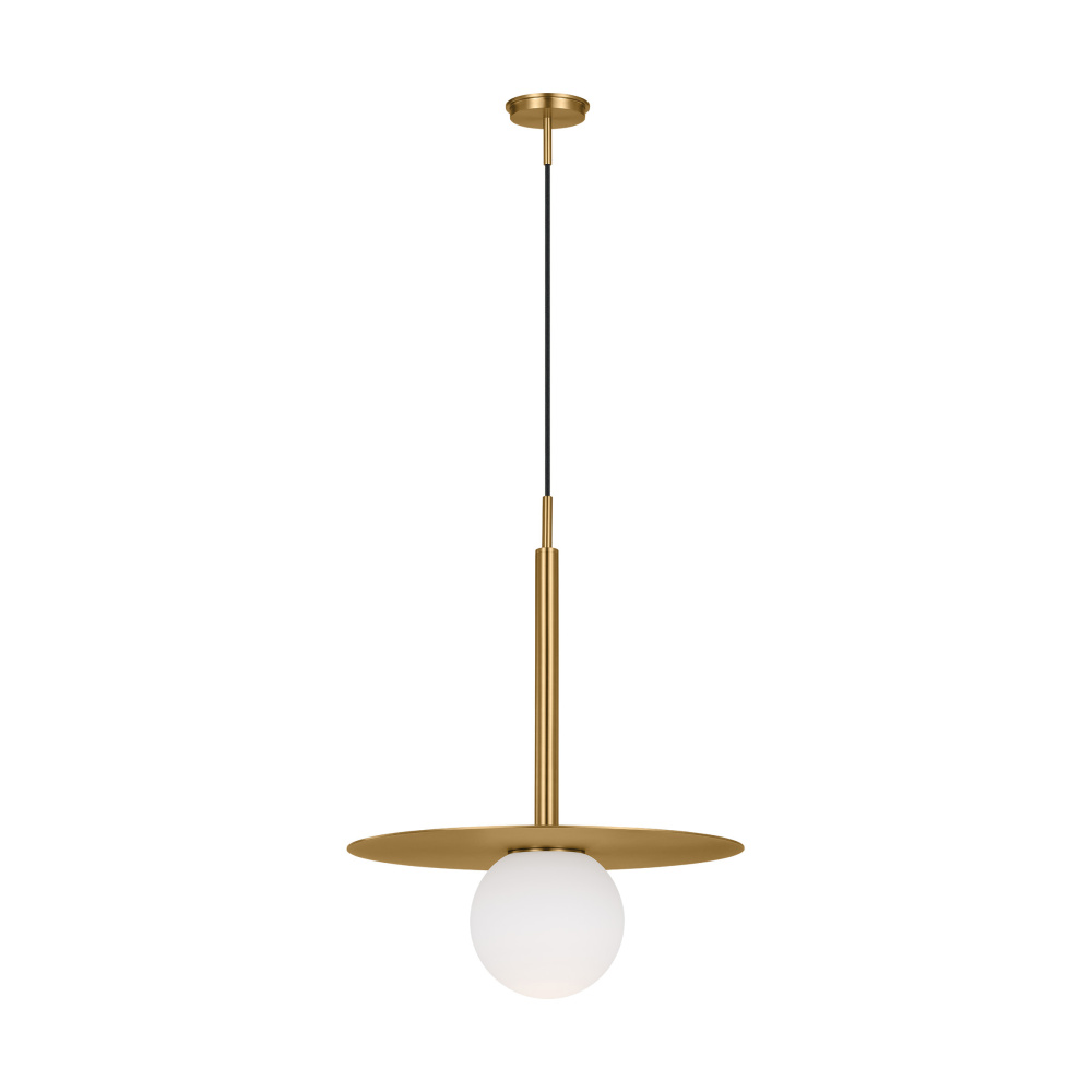The Nodes one light indoor pendant in burnished brass provides abundant light to your home, while adding style and interest. Nodes task, ceiling and wall lighting is minimal yet bold, highlighting Kelly's distinctive juxtaposition of mixed-materiality and curvilinear form. Light radiates from milk glass globes set against metal discs. All fixtures can be used or without the discs. The cast canopy is available in Burnished Brass or Midnight Black. Hanging fixtures within this family feature black fabric cords, while pivot sconces can be cord and plug or hard wire.