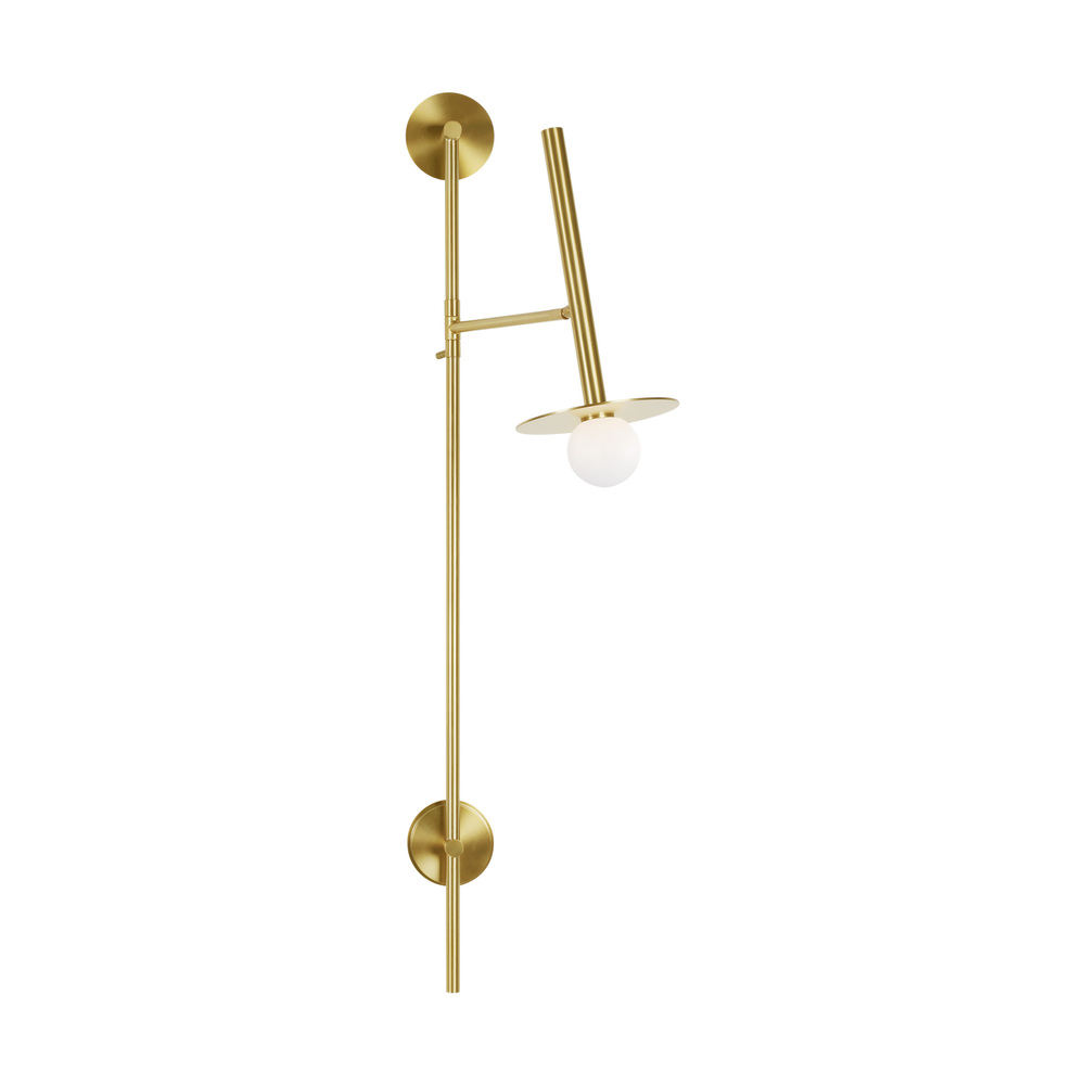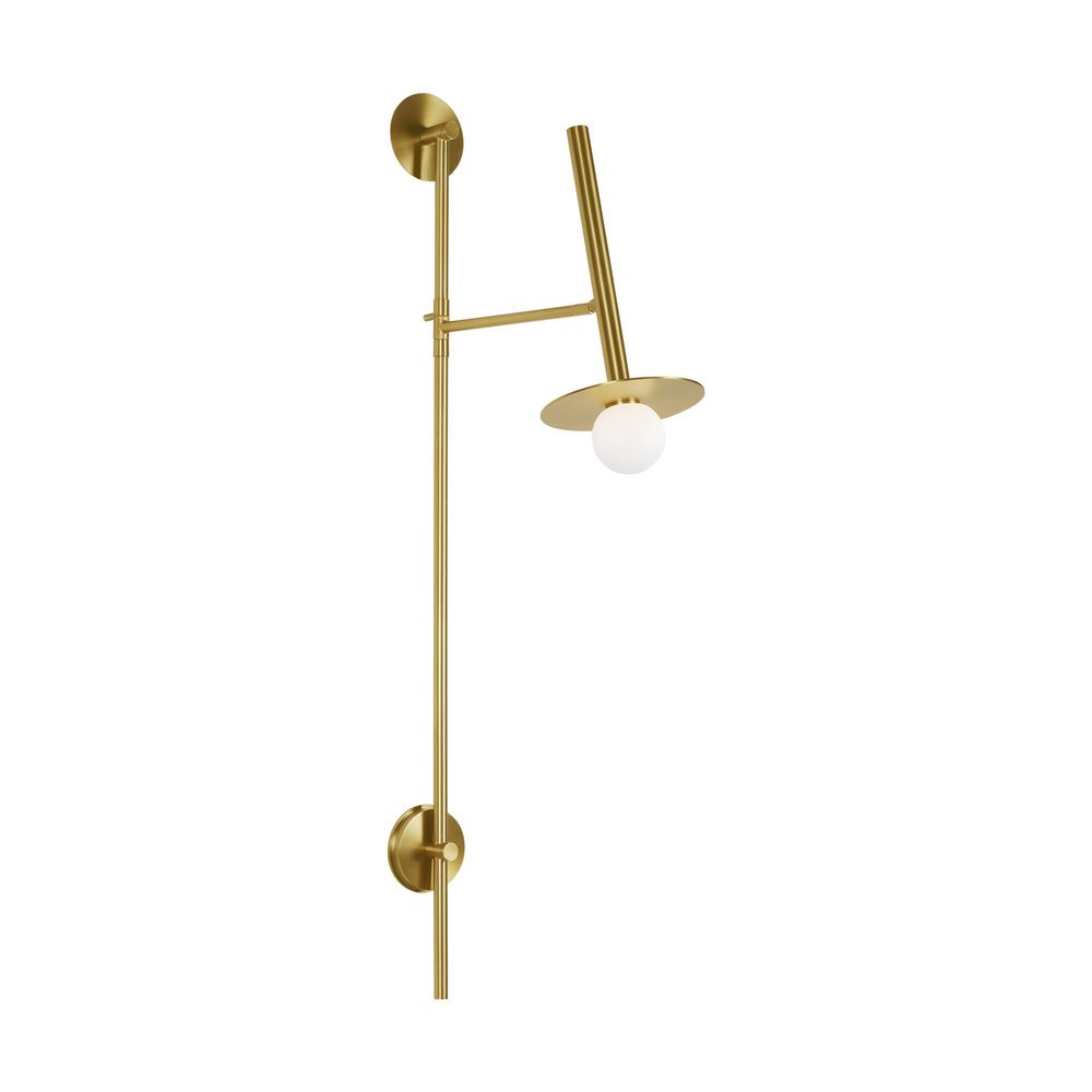 Nodes task, ceiling and wall lighting is minimal yet bold, highlighting Kelly's distinctive juxtaposition of mixed-materiality and curvilinear form. Light radiates from milk glass globes set against metal discs. All fixtures can be used or without the discs. The cast canopy is available in Burnished Brass or Midnight Black. Hanging fixtures within this family feature black fabric cords, while pivot sconces can be cord and plug or hard wire.
