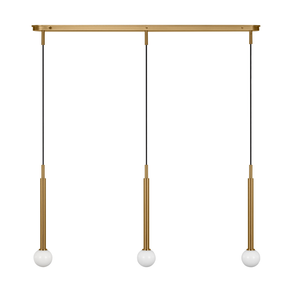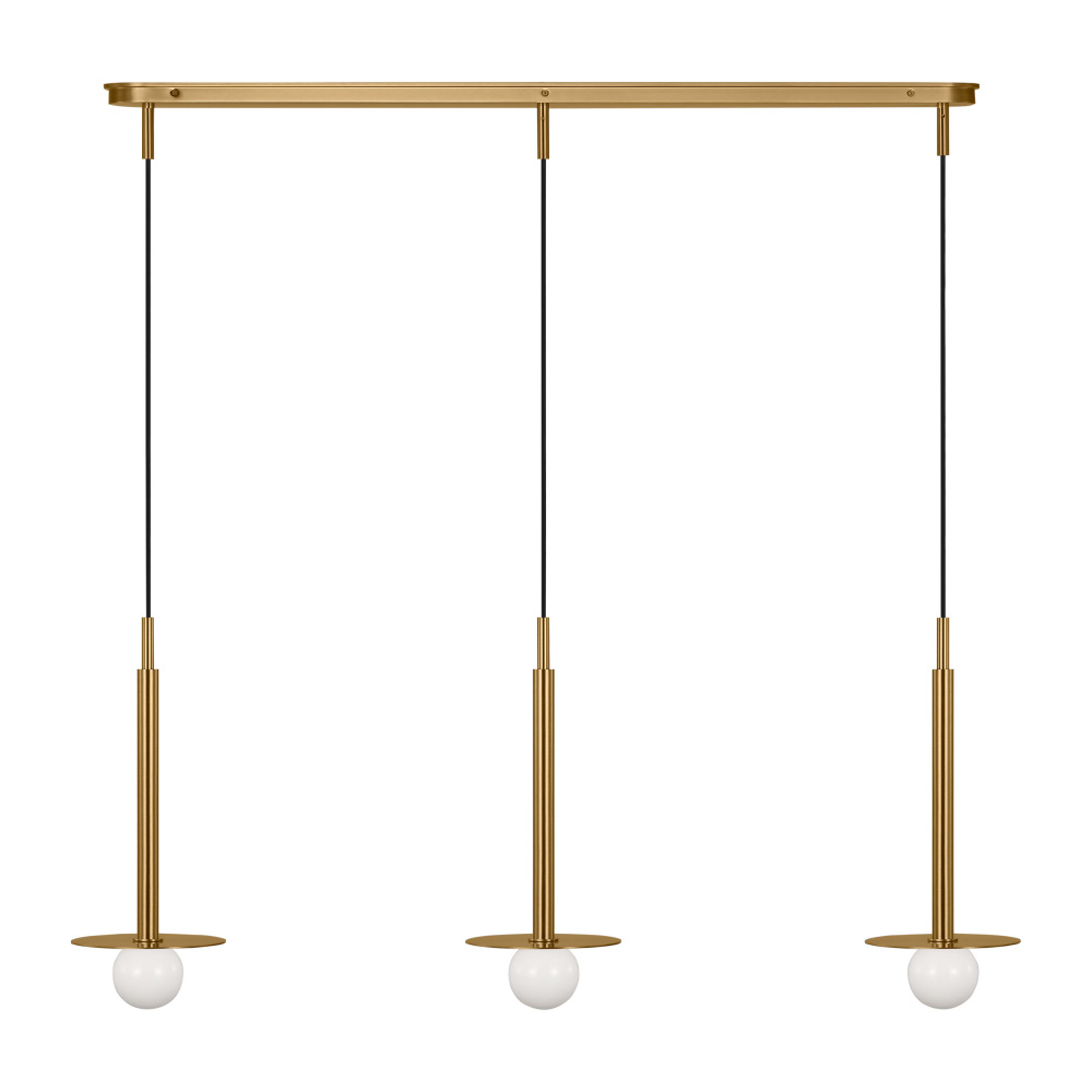 Light radiates from milk glass globes set against removable metal discs.